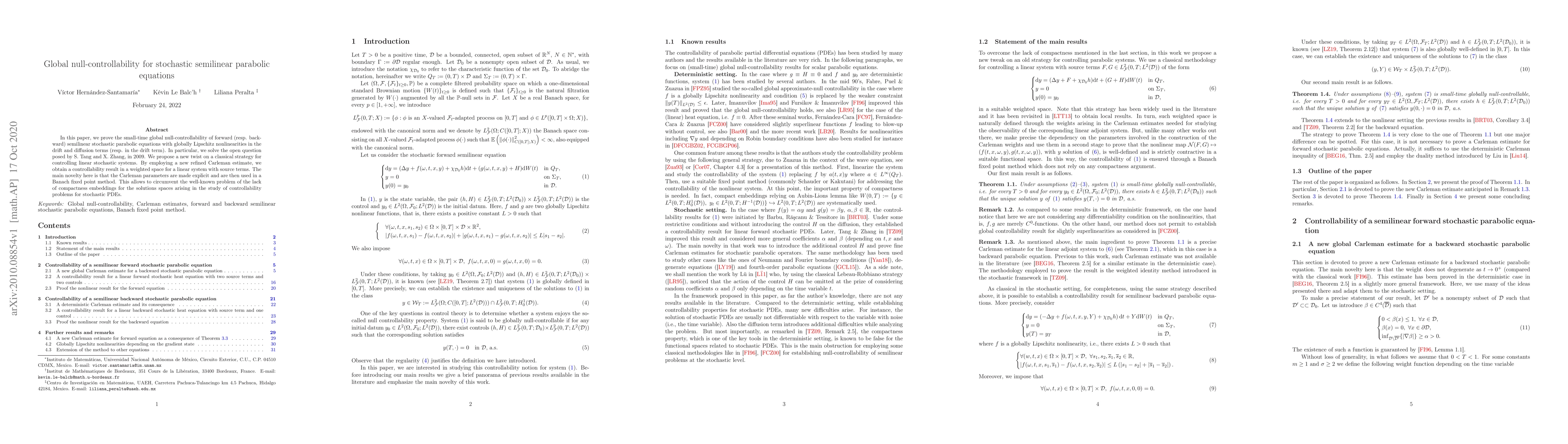 In this paper, we prove the small-time global null-controllability of forward (resp. backward) semilinear stochastic parabolic equations with globally Lipschitz nonlinearities in the drift and diffusion terms (resp. in the drift term). In particular, we solve the open question posed by S. Tang and X. Zhang, in 2009. We propose a new twist on a classical strategy for controlling linear stochastic systems. By employing a new refined Carleman estimate, we obtain a controllability result in a weighted space for a linear system with source terms. The main novelty here is that the Carleman parameters are made explicit and are then used in a Banach fixed point method. This allows to circumvent the well-known problem of the lack of compactness embeddings for the solutions spaces arising in the study of controllability problems for stochastic PDEs.