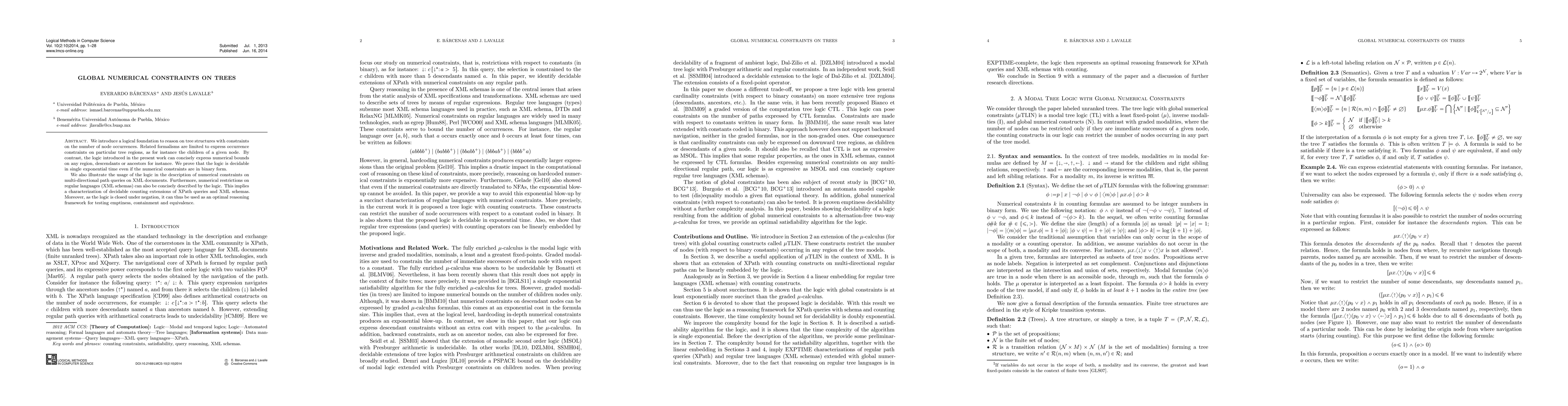 We introduce a logical foundation to reason on tree structures with constraints on the number of node occurrences. Related formalisms are limited to express occurrence constraints on particular tree regions, as for instance the children of a given node. By contrast, the logic introduced in the present work can concisely express numerical bounds on any region, descendants or ancestors for instance. We prove that the logic is decidable in single exponential time even if the numerical constraints are in binary form. We also illustrate the usage of the logic in the description of numerical constraints on multi-directional path queries on XML documents. Furthermore, numerical restrictions on regular languages (XML schemas) can also be concisely described by the logic. This implies a characterization of decidable counting extensions of XPath queries and XML schemas. Moreover, as the logic is closed under negation, it can thus be used as an optimal reasoning framework for testing emptiness, containment and equivalence.