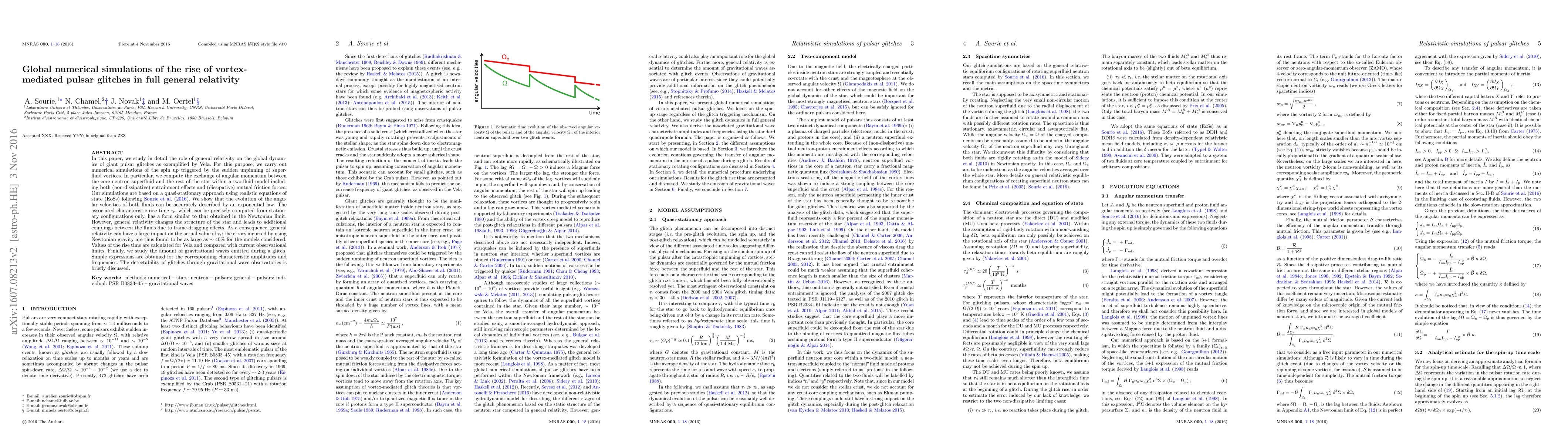 This paper investigates the influence of general relativity on the dynamics of pulsar glitches using global numerical simulations. It finds that general relativity significantly alters the rise time of glitches, with errors from Newtonian calculations reaching up to 40%, and estimates the gravitational wave emissions during a glitch.