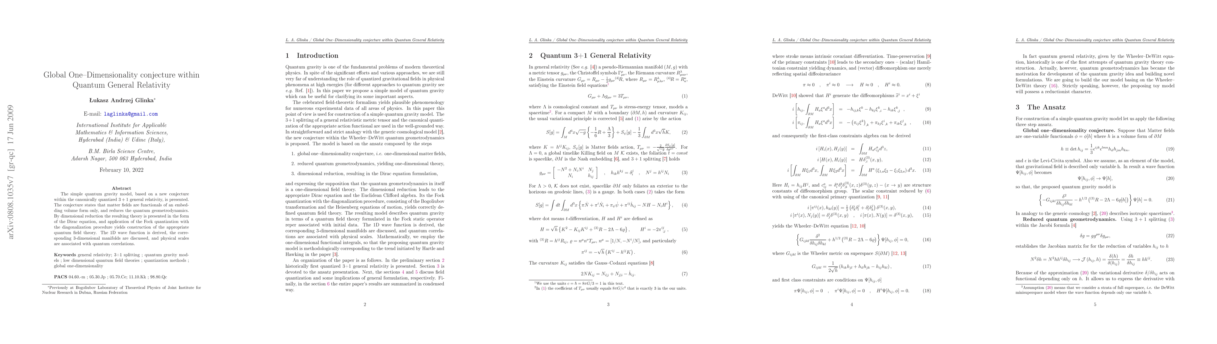 This paper proposes a new quantum gravity model based on the Global One-Dimensionality conjecture, suggesting that matter fields depend solely on an embedding volume form, leading to a simplified quantum geometrodynamics. The resulting theory is formulated using the Dirac equation and Fock quantization, deriving a 1D wave function and linking physical scales to quantum correlations.