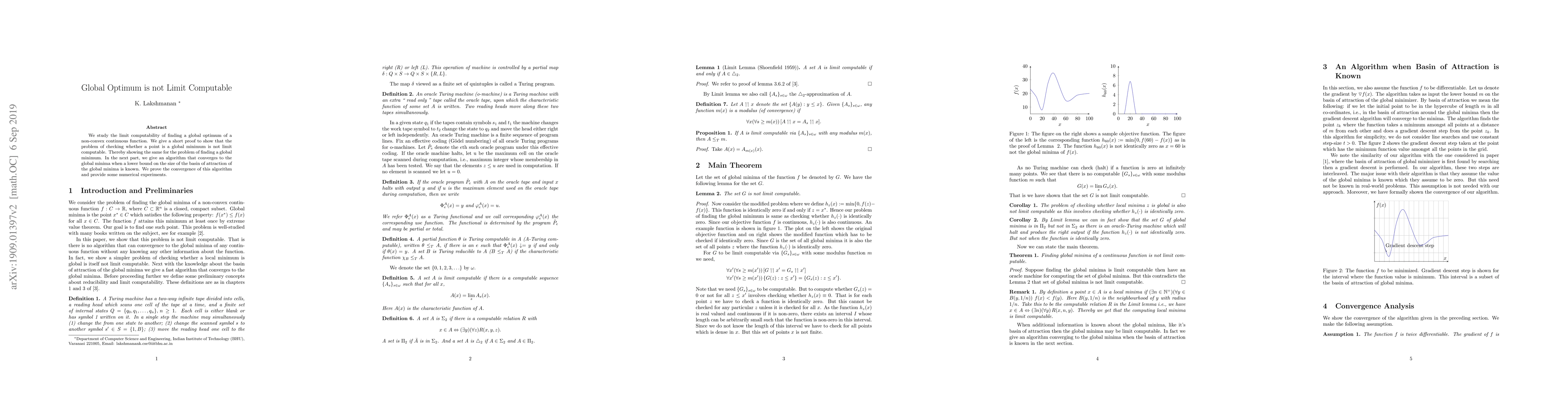 We study the limit computability of finding a global optimum of a continuous function. We give a short proof to show that the problem of checking whether a point is a global minimum is not limit computable. Thereby showing the same for the problem of finding a global minimum. In the next part, we give an algorithm that converges to the global minima when a lower bound on the size of the basin of attraction of the global minima is known. We prove the convergence of this algorithm and provide some numerical experiments.