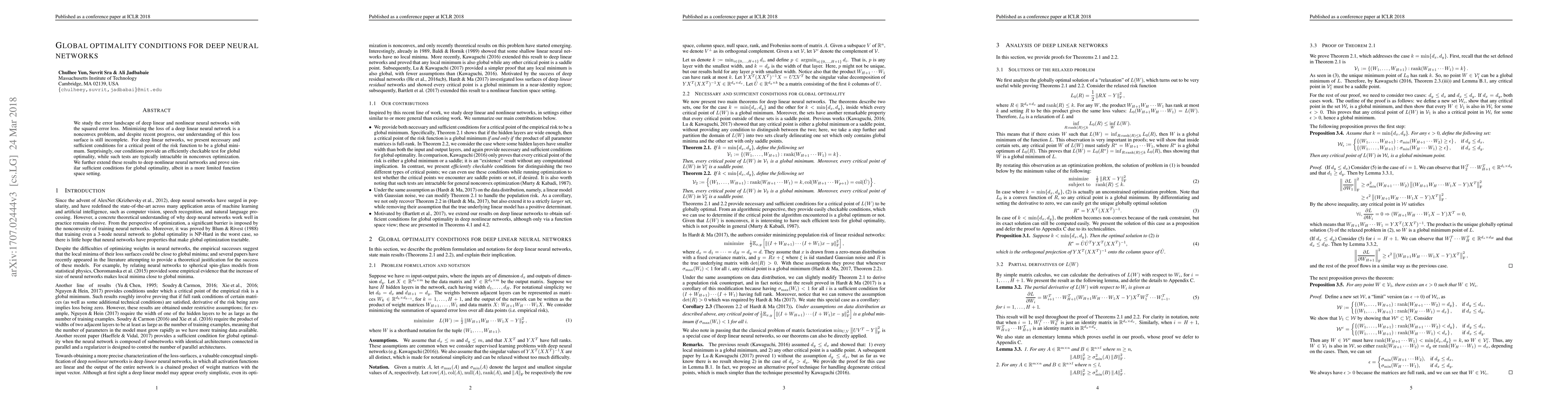 The paper presents efficiently verifiable conditions for global optimality in both linear and nonlinear deep neural networks, advancing theoretical understanding of nonconvex optimization in deep learning.