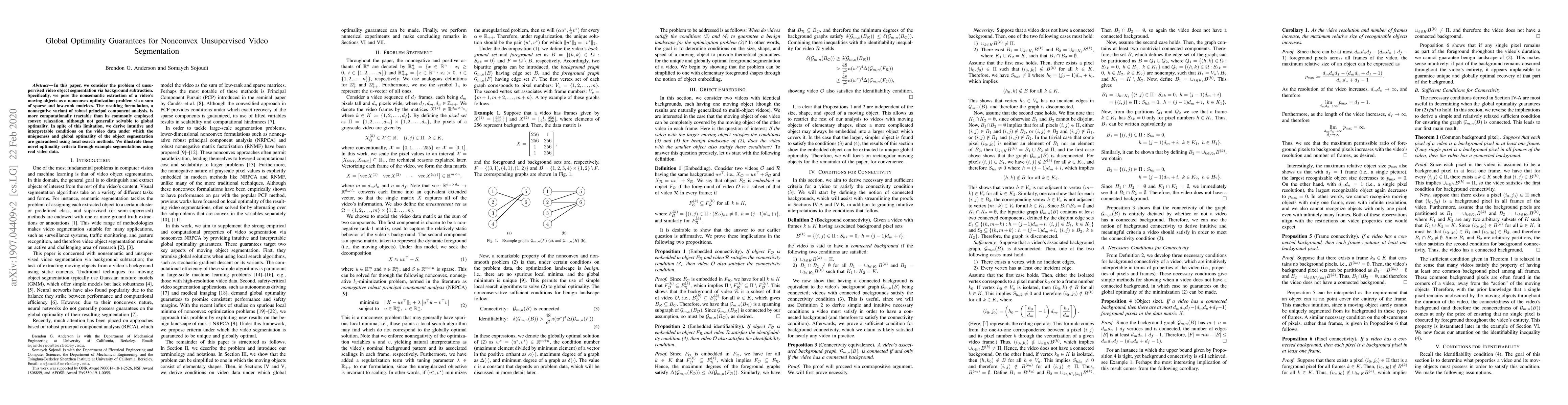 This paper develops a novel framework for unsupervised video object segmentation that guarantees global optimality under specific conditions, using nonconvex optimization methods with local search.