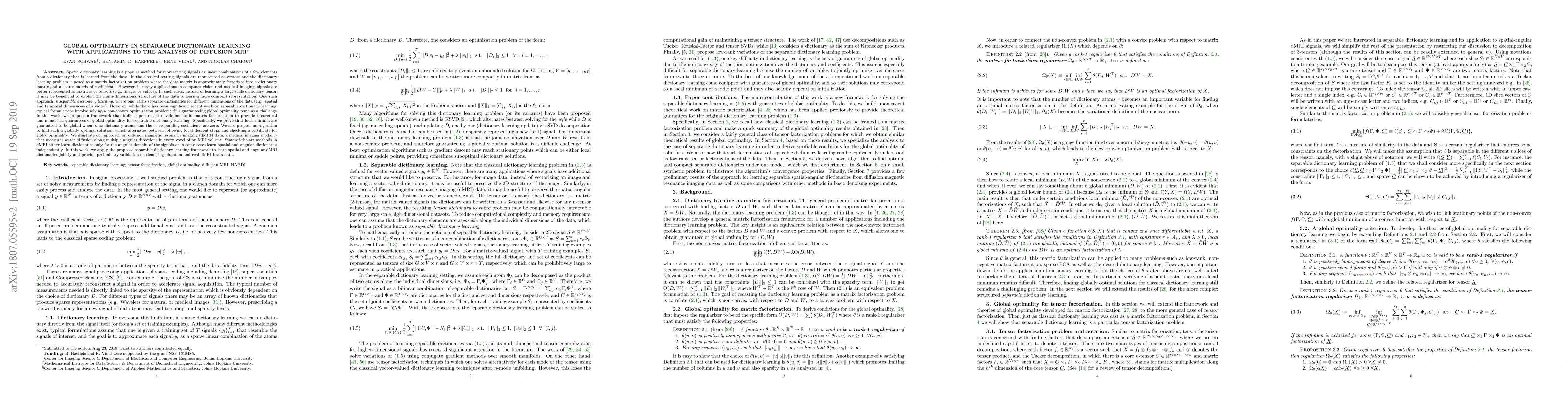 This paper proposes a framework for achieving global optimality in separable dictionary learning, addressing the non-convex optimization challenge. The method is demonstrated on diffusion MRI data, where it learns joint spatial and angular dictionaries, outperforming existing state-of-the-art techniques in denoising tasks.