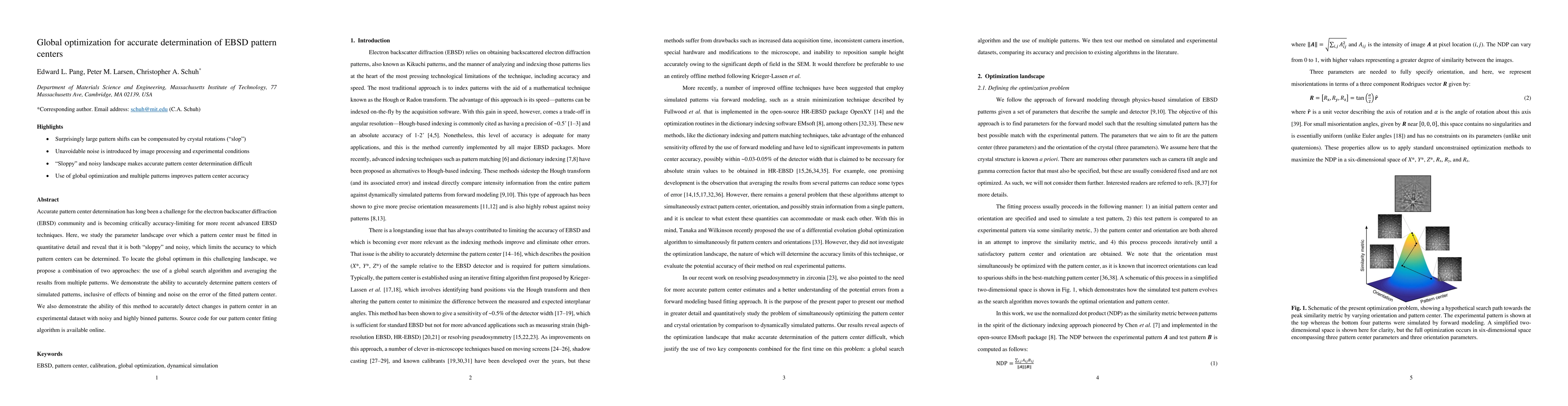 This paper proposes a global optimization method combining a global search algorithm and pattern averaging to accurately determine electron backscatter diffraction (EBSD) pattern centers, which are critical for advanced EBSD techniques. The method effectively mitigates the challenges of a noisy and complex parameter landscape, demonstrated through both simulated and experimental datasets.