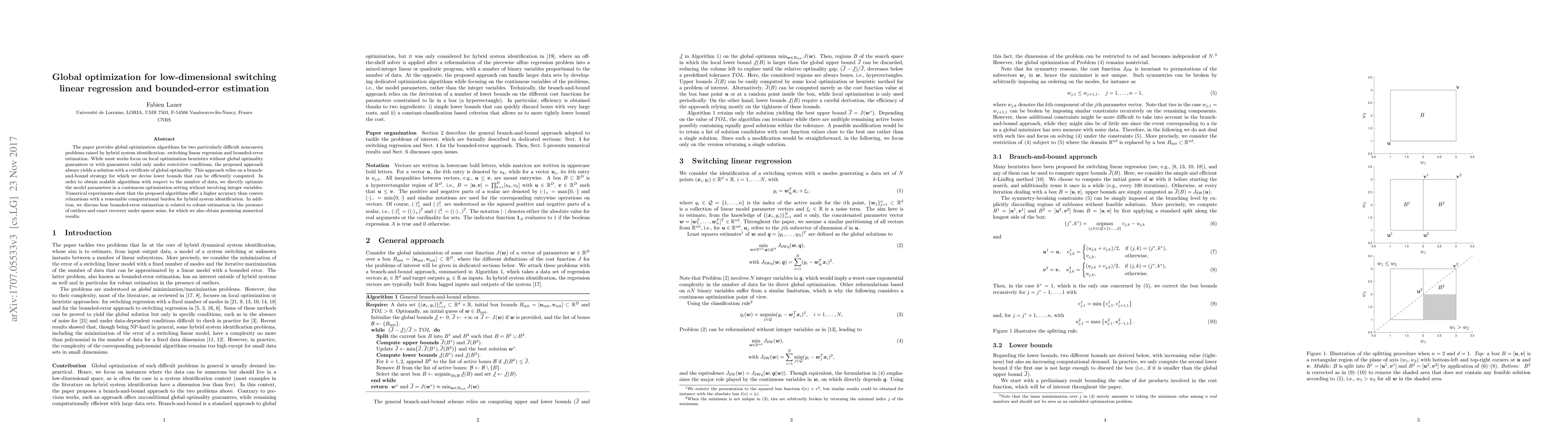 The paper presents global optimization algorithms for switching linear regression and bounded-error estimation in hybrid systems, offering global optimality guarantees through a branch-and-bound strategy. The proposed continuous optimization approach achieves higher accuracy than convex relaxations with reasonable computational efficiency.