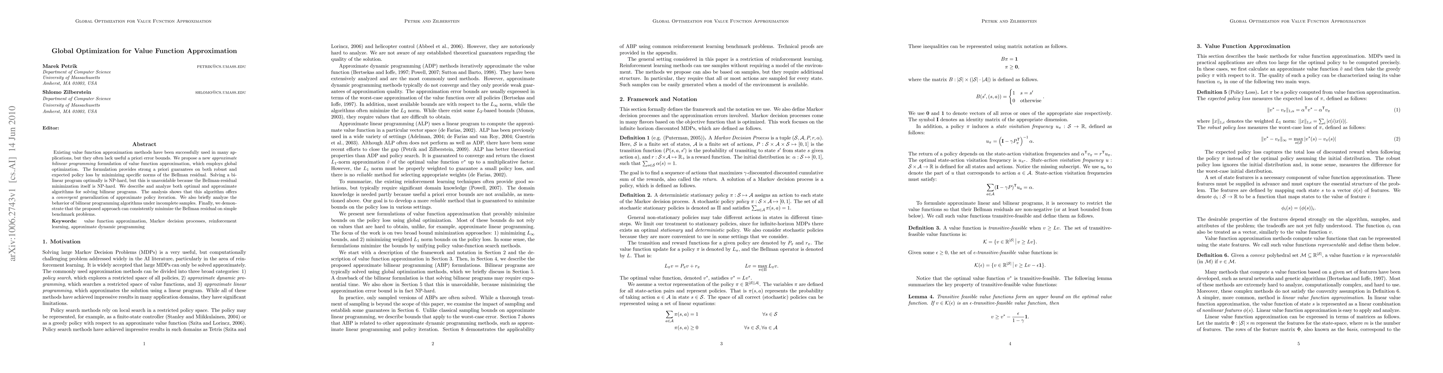 A new method for value function approximation uses global optimization to provide strong error bounds on policy loss, offering a convergent generalization of approximate policy iteration.