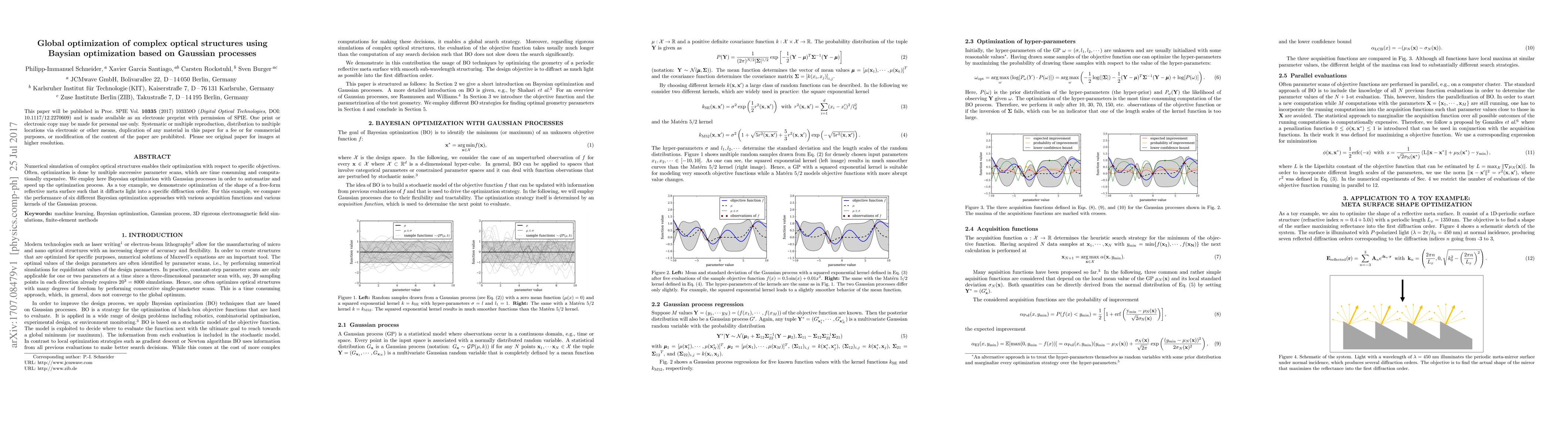Numerical simulation of complex optical structures enables their optimization with respect to specific objectives. Often, optimization is done by multiple successive parameter scans, which are time consuming and computationally expensive. We employ here Bayesian optimization with Gaussian processes in order to automatize and speed up the optimization process. As a toy example, we demonstrate optimization of the shape of a free-form reflective meta surface such that it diffracts light into a specific diffraction order. For this example, we compare the performance of six different Bayesian optimization approaches with various acquisition functions and various kernels of the Gaussian process.