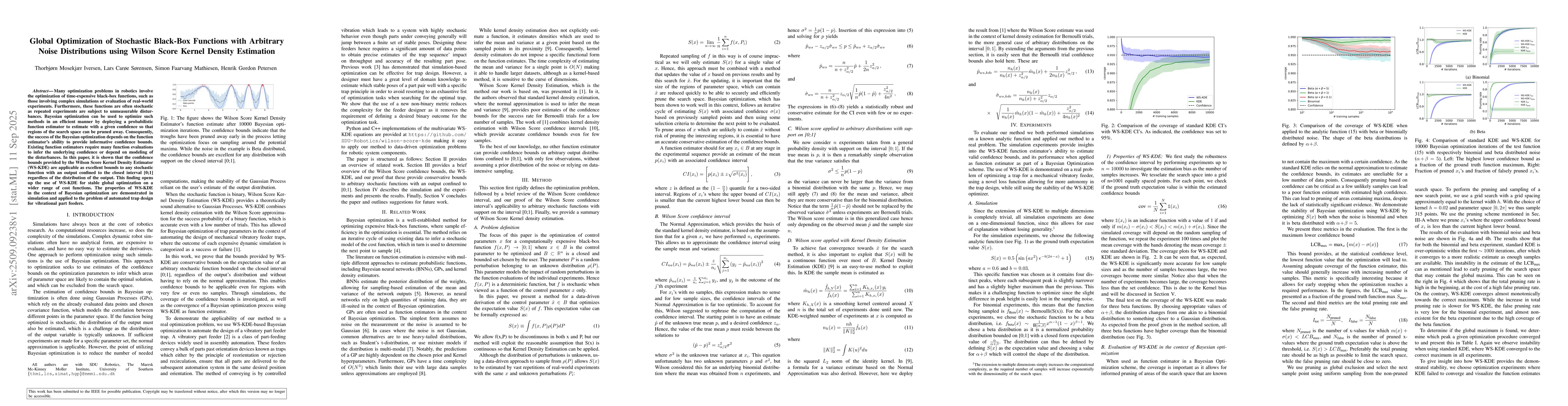 Many optimization problems in robotics involve the optimization of time-expensive black-box functions, such as those involving complex simulations or evaluation of real-world experiments. Furthermore, these functions are often stochastic as repeated experiments are subject to unmeasurable disturbances. Bayesian optimization can be used to optimize such methods in an efficient manner by deploying a probabilistic function estimator to estimate with a given confidence so that regions of the search space can be pruned away. Consequently, the success of the Bayesian optimization depends on the function estimator's ability to provide informative confidence bounds. Existing function estimators require many function evaluations to infer the underlying confidence or depend on modeling of the disturbances. In this paper, it is shown that the confidence bounds provided by the Wilson Score Kernel Density Estimator (WS-KDE) are applicable as excellent bounds to any stochastic function with an output confined to the closed interval [0;1] regardless of the distribution of the output. This finding opens up the use of WS-KDE for stable global optimization on a wider range of cost functions. The properties of WS-KDE in the context of Bayesian optimization are demonstrated in simulation and applied to the problem of automated trap design for vibrational part feeders.