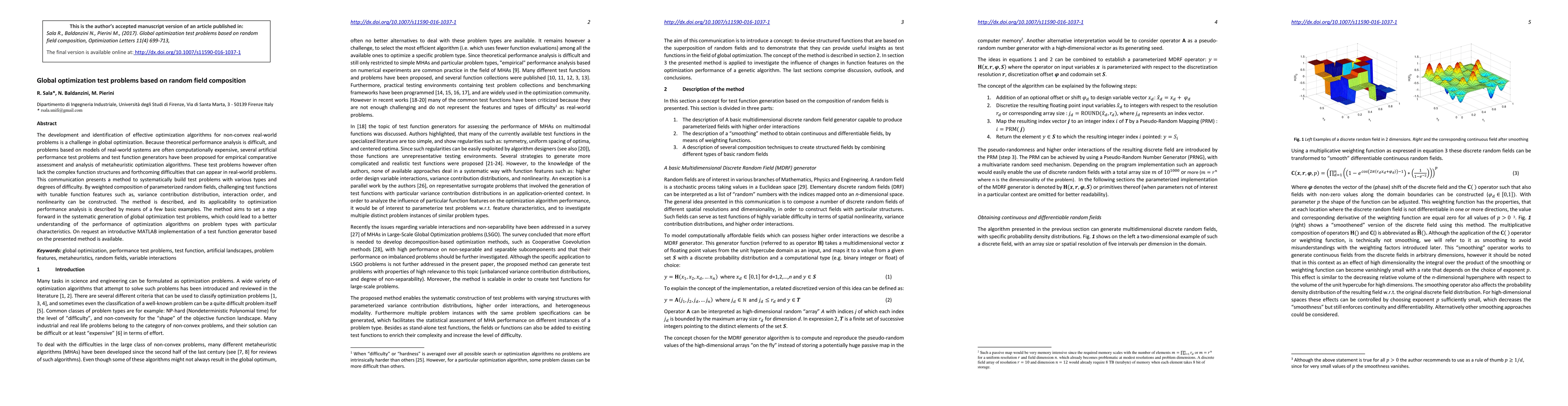 Researchers developed a method to create realistic test problems for global optimization algorithms using weighted composition of random fields, enabling analysis of optimization performance on diverse problem types.