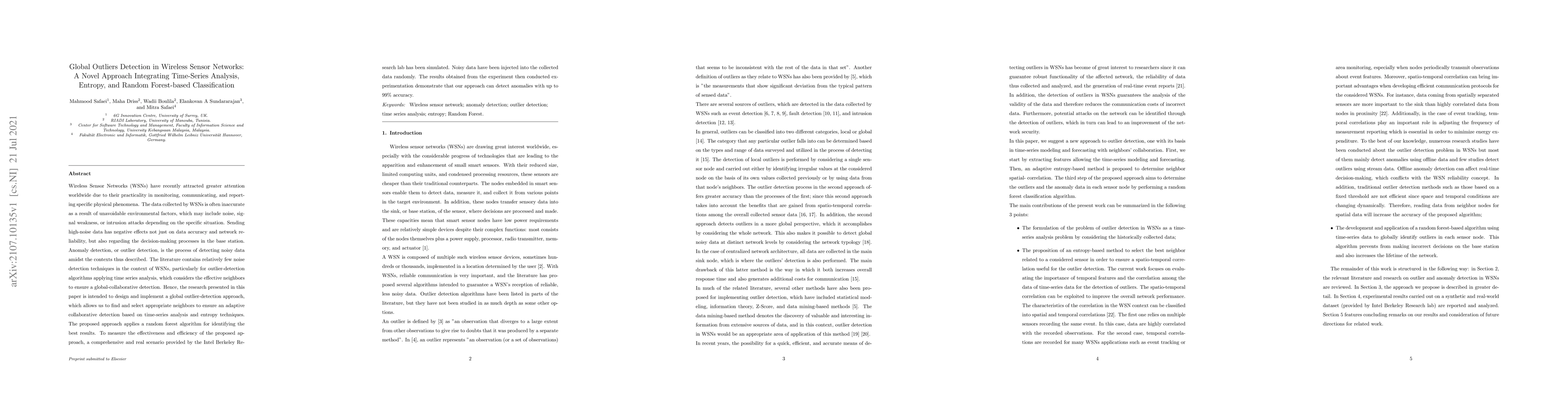 Wireless Sensor Networks (WSNs) have recently attracted greater attention worldwide due to their practicality in monitoring, communicating, and reporting specific physical phenomena. The data collected by WSNs is often inaccurate as a result of unavoidable environmental factors, which may include noise, signal weakness, or intrusion attacks depending on the specific situation. Sending high-noise data has negative effects not just on data accuracy and network reliability, but also regarding the decision-making processes in the base station. Anomaly detection, or outlier detection, is the process of detecting noisy data amidst the contexts thus described. The literature contains relatively few noise detection techniques in the context of WSNs, particularly for outlier-detection algorithms applying time series analysis, which considers the effective neighbors to ensure a global-collaborative detection. Hence, the research presented in this paper is intended to design and implement a global outlier-detection approach, which allows us to find and select appropriate neighbors to ensure an adaptive collaborative detection based on time-series analysis and entropy techniques. The proposed approach applies a random forest algorithm for identifying the best results. To measure the effectiveness and efficiency of the proposed approach, a comprehensive and real scenario provided by the Intel Berkeley Research lab has been simulated. Noisy data have been injected into the collected data randomly. The results obtained from the experiment then conducted experimentation demonstrate that our approach can detect anomalies with up to 99% accuracy.