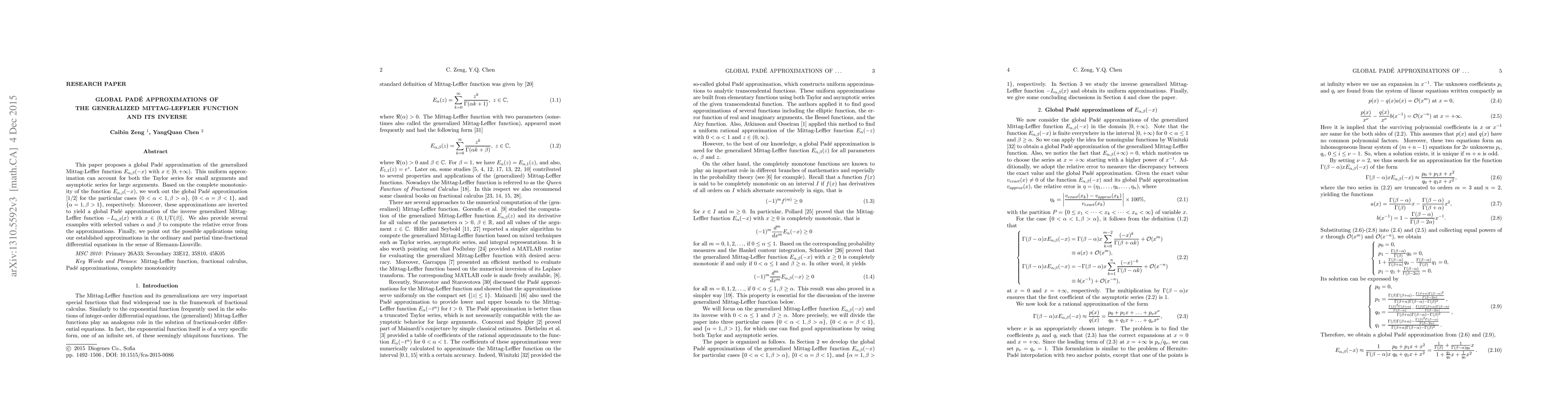 This paper proposes global Padé approximations for the generalized Mittag-Leffler function and its inverse, providing uniform approximations that cover both small and large argument behaviors. It also explores the inverse function and discusses potential applications in time-fractional differential equations.