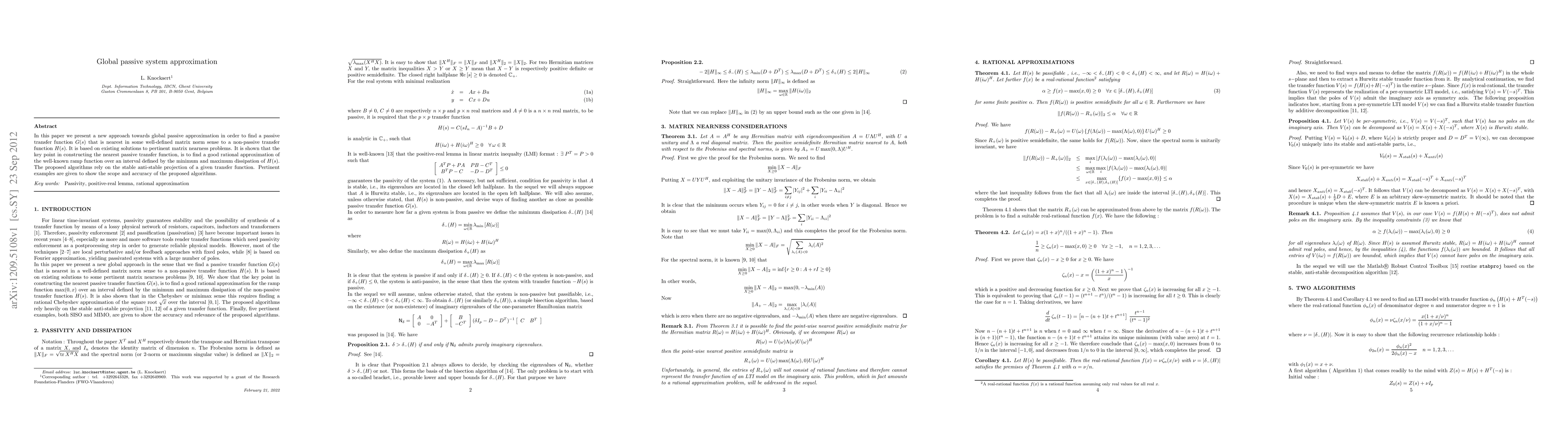 In this paper we present a new approach towards global passive approximation in order to find a passive transfer function G(s) that is nearest in some well-defined matrix norm sense to a non-passive transfer function H(s). It is based on existing solutions to pertinent matrix nearness problems. It is shown that the key point in constructing the nearest passive transfer function, is to find a good rational approximation of the well-known ramp function over an interval defined by the minimum and maximum dissipation of H(s). The proposed algorithms rely on the stable anti-stable projection of a given transfer function. Pertinent examples are given to show the scope and accuracy of the proposed algorithms.