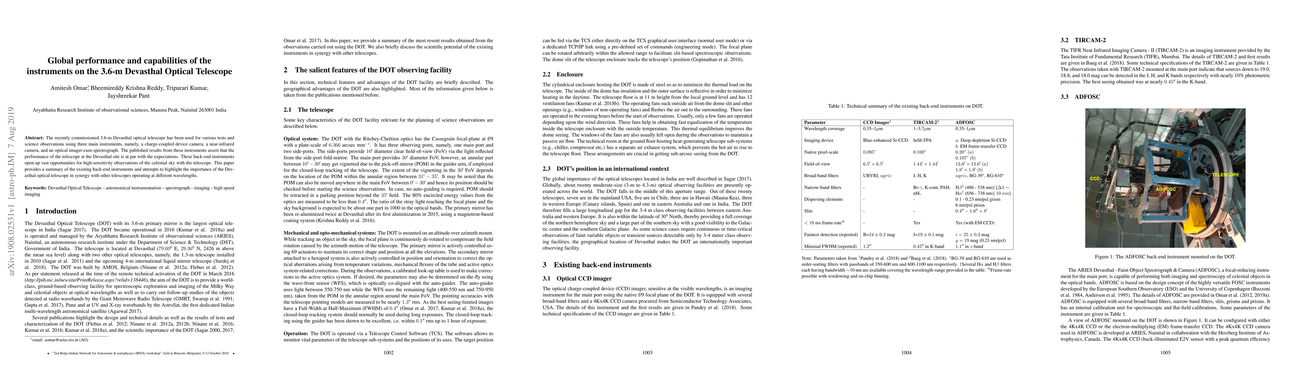 The 3.6-m Devasthal Optical Telescope, equipped with a CCD camera, a near-infrared camera, and an optical imager-cum-spectrograph, has demonstrated performance meeting expectations. These instruments enable high-sensitivity observations, underscoring the telescope's significance alongside other multi-wavelength observatories.