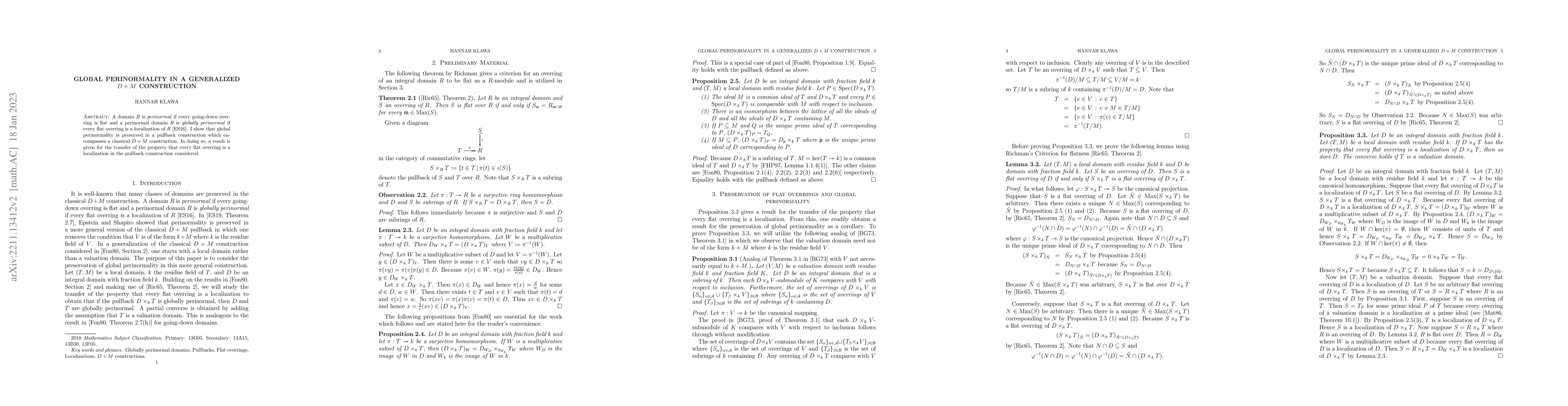 This paper demonstrates that global perinormality, a property where every flat overring is a localization of the original domain, is preserved in a generalized $D + M$ construction, including classical pullbacks. The study provides a result on the transfer of this property in such constructions.