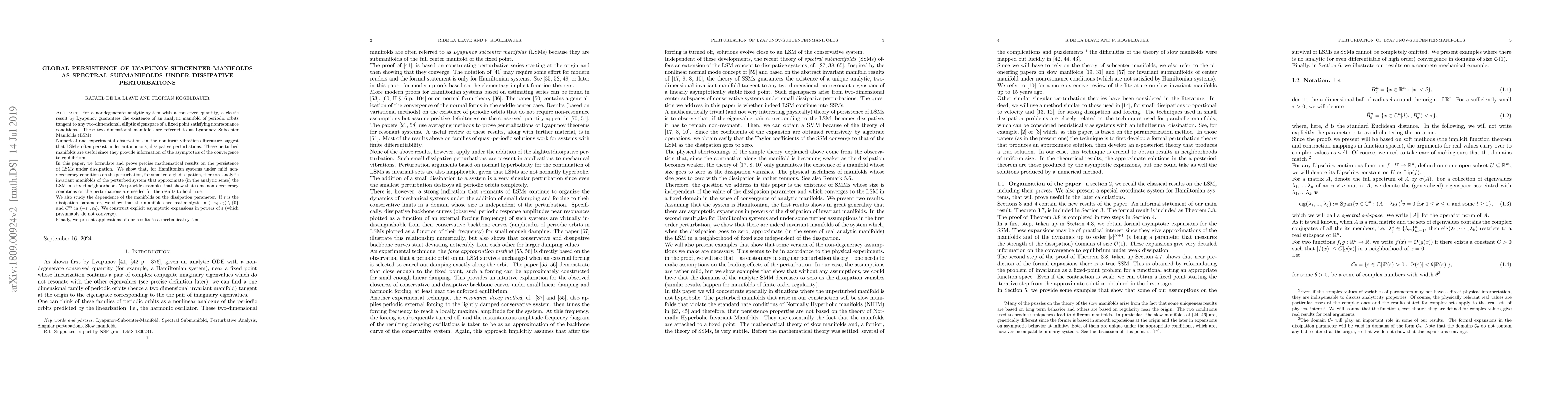 This research paper presents mathematical results proving the persistence of Lyapunov Subcenter Manifolds (LSM) under dissipative perturbations for analytic systems with conserved quantities. The study demonstrates that for small dissipation, there are analytic invariant manifolds approximating LSM in a fixed neighborhood, given mild non-degeneracy conditions on perturbations. The manifolds' dependence on the dissipation parameter is analyzed, showing they are real analytic in a small interval around zero and $C^infty$ in the entire interval. The findings are applied to various mechanical systems, providing insights into asymptotic convergence to equilibrium.