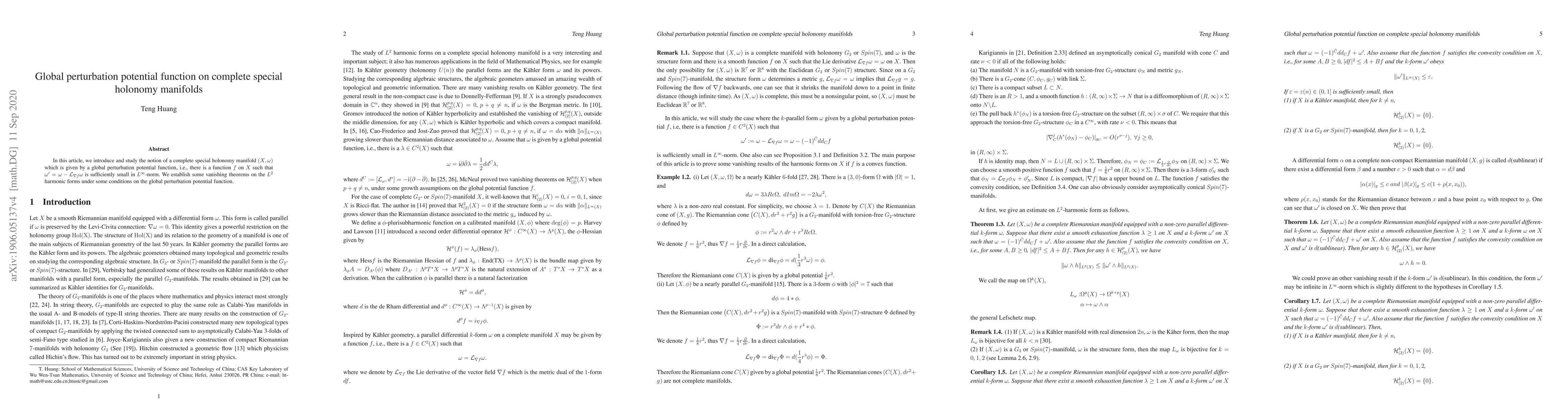 This paper introduces a global perturbation potential function for complete special holonomy manifolds and examines its effects, establishing vanishing theorems for $L^{2}$ harmonic forms under specific conditions on the potential function.