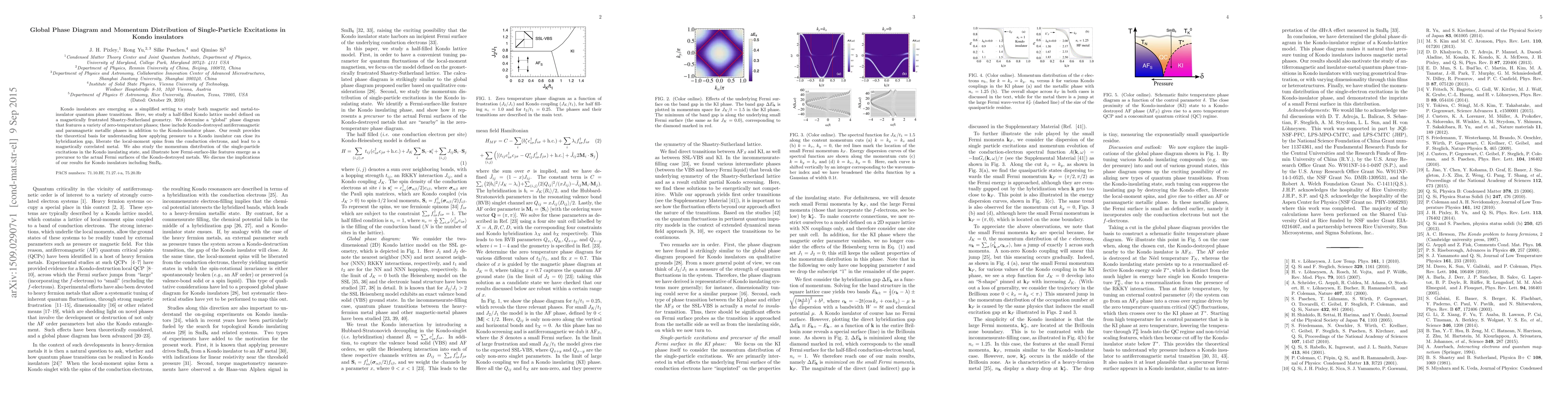 This paper presents a comprehensive phase diagram for a half-filled Kondo lattice model on a Shastry-Sutherland lattice, revealing various zero-temperature phases including Kondo-insulator and metallic states. It also investigates the momentum distribution of single-particle excitations, showing the emergence of Fermi-surface-like features in the Kondo insulating state.