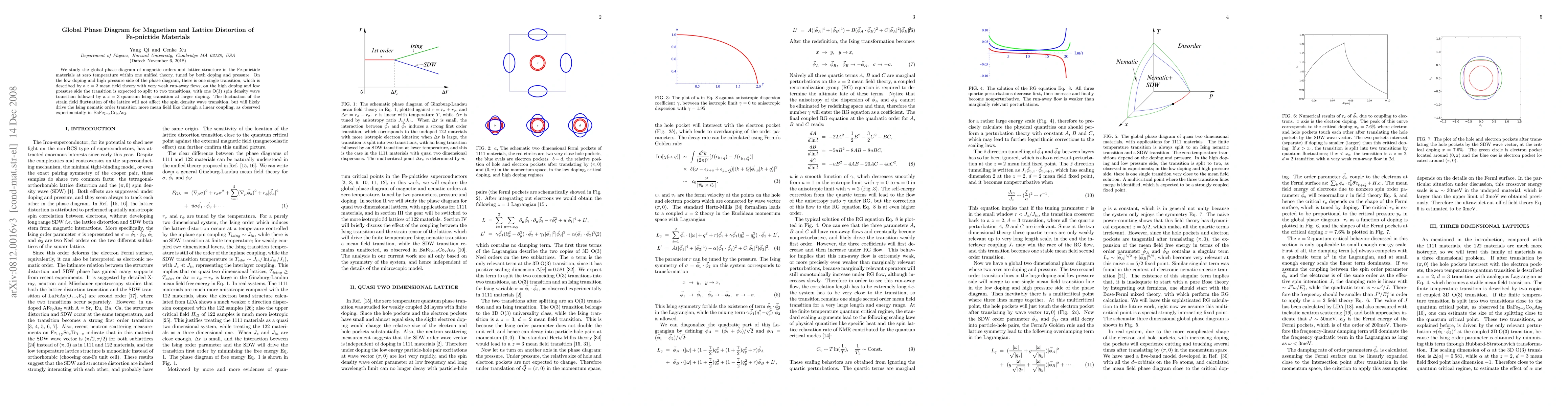 We study the global phase diagram of magnetic orders and lattice structure in the Fe-pnictide materials at zero temperature within one unified theory, tuned by both doping and pressure. On the low doping and high pressure side of the phase diagram, there is one single transition, which is described by a $z=2$ mean field theory with very weak run-away flows; on the high doping and low pressure side the transition is expected to split to two transitions, with one O(3) spin density wave transition followed by a z = 3 quantum Ising transition at larger doping. The fluctuation of the strain field fluctuation of the lattice will not affect the spin density wave transition, but will likely drive the Ising nematic transition more mean field like through a linear coupling, as observed experimentally in BaFe_2-xCo_xAs_2.
