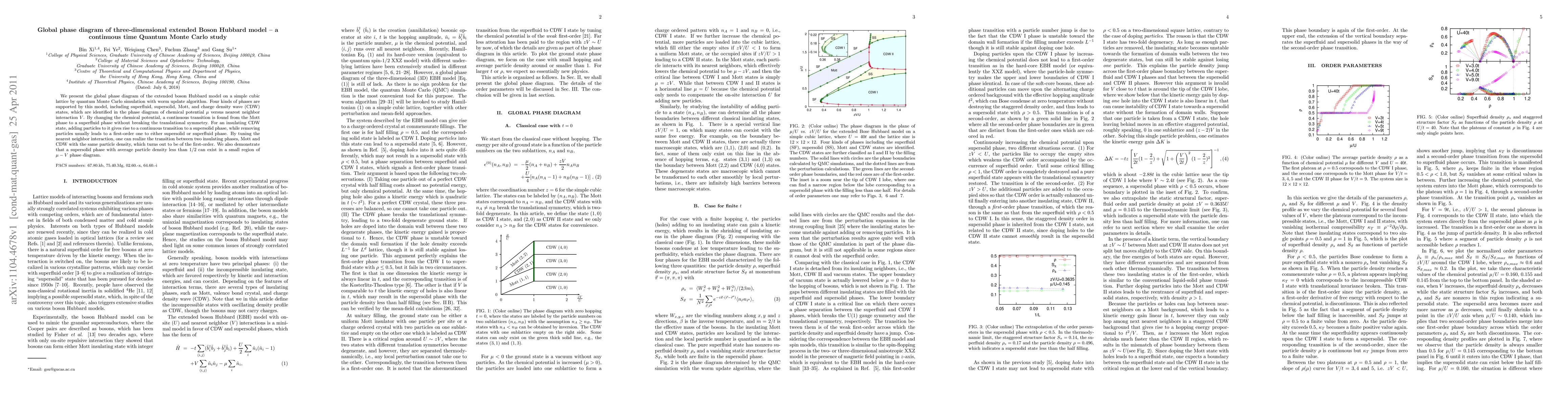 This study uses continuous time Quantum Monte Carlo simulations to map the global phase diagram of the extended boson Hubbard model, identifying four phases: superfluid, supersolid, Mott, and charge density wave. The research reveals continuous transitions between phases and first-order transitions under varying particle density and interaction strength.