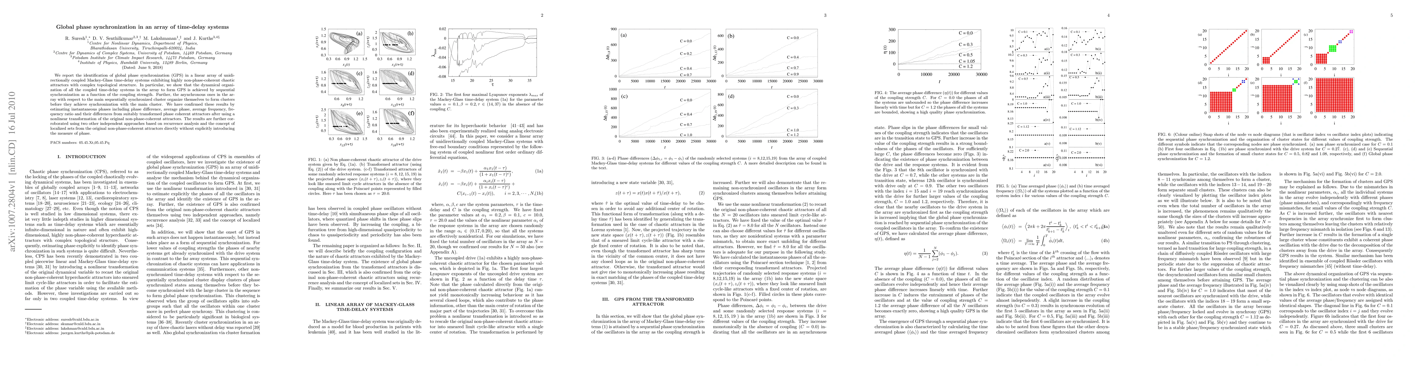 This paper identifies global phase synchronization (GPS) in a linear array of Mackey-Glass time-delay systems, demonstrating that sequential synchronization occurs as coupling strength increases. The study confirms these findings through various phase estimation techniques and corroborates results using recurrence analysis and localized sets.