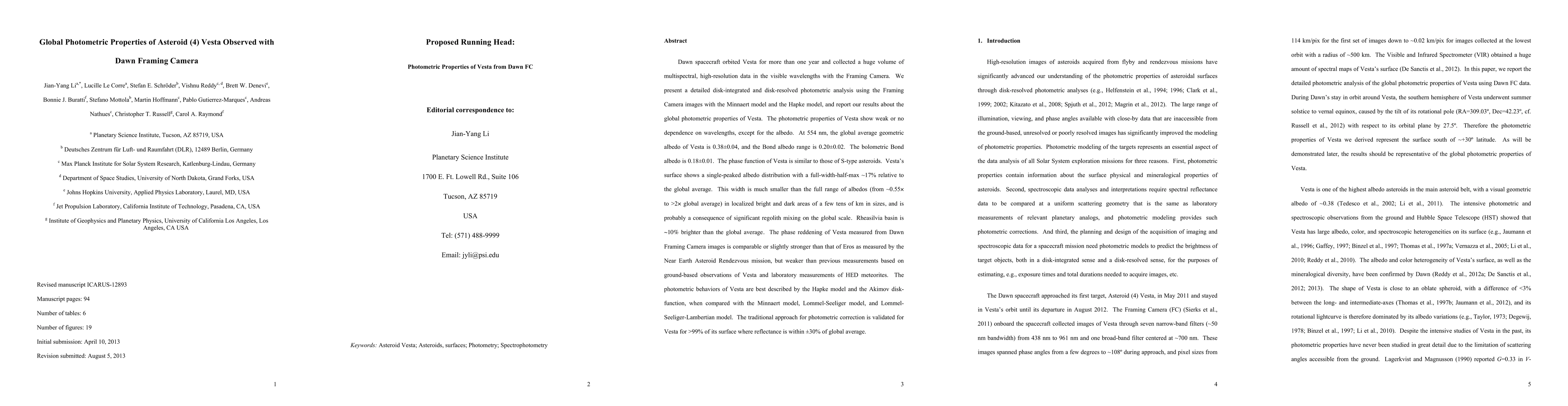 This paper analyzes the global photometric properties of asteroid Vesta using Dawn spacecraft Framing Camera data, revealing a weak wavelength dependence in albedo. The global average geometric albedo at 554 nm is 0.38, and the surface shows a single-peaked albedo distribution, with localized bright and dark areas indicating significant regolith mixing.