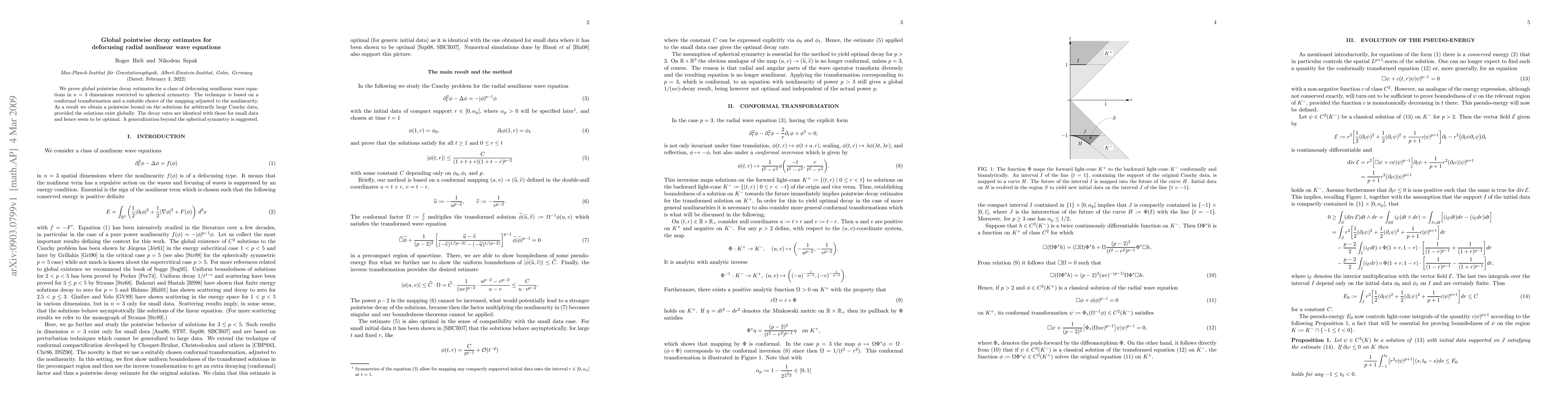 This paper proves global pointwise decay estimates for defocusing radial nonlinear wave equations in three dimensions using a conformal transformation and a tailored mapping. The derived decay rates match those for small initial data, suggesting optimality.