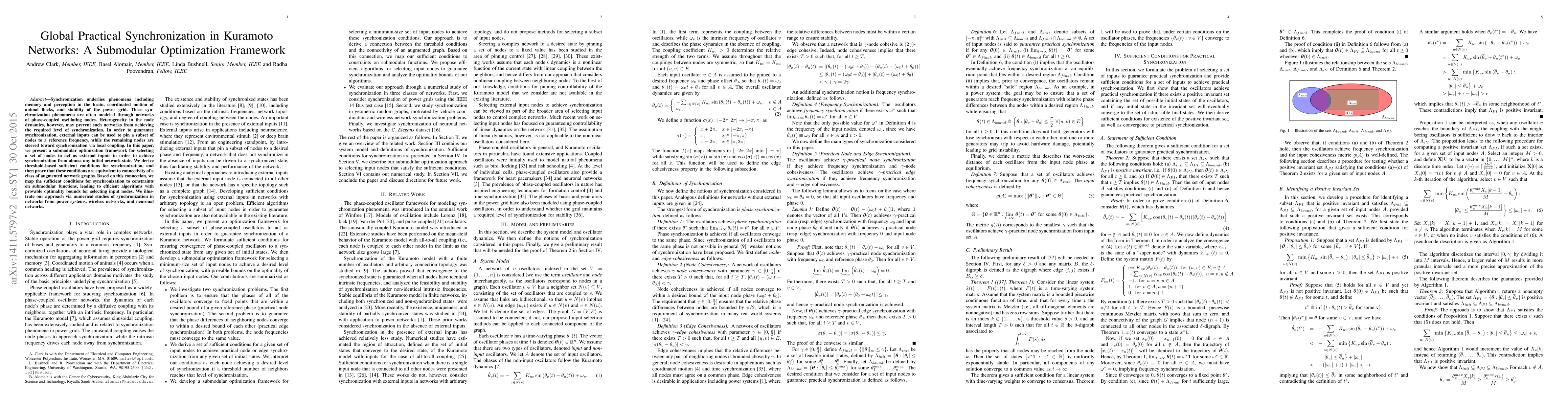 This paper proposes a submodular optimization framework for achieving global synchronization in Kuramoto networks by selecting optimal nodes to act as external inputs. The authors derive synchronization conditions and prove their equivalence to network graph connectivity, leading to efficient algorithms for node selection with optimal guarantees.