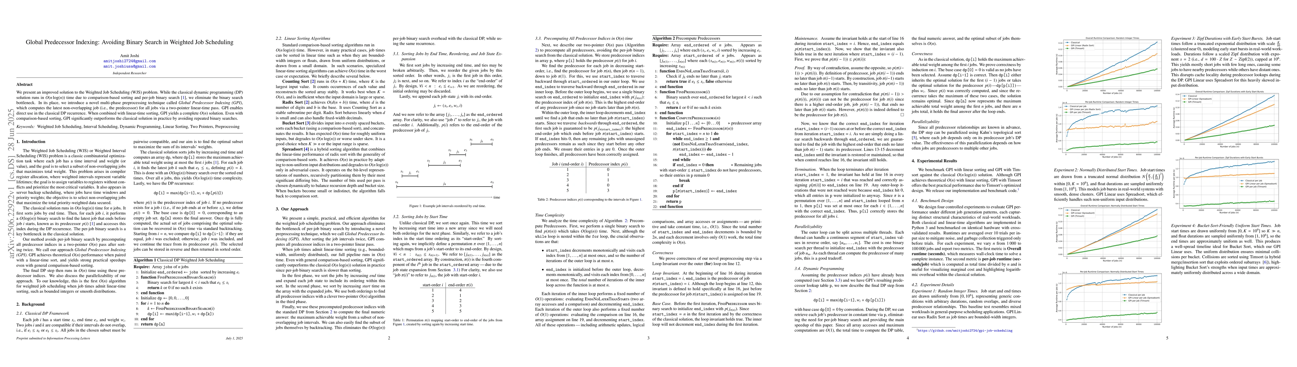 We present an improved solution to the Weighted Job Scheduling (WJS) problem. While the classical dynamic programming (DP) solution runs in $O(n \log(n))$ time due to comparison-based sorting and per-job binary search, we eliminate the binary search bottleneck. In its place, we introduce a novel multi-phase preprocessing technique called Global Predecessor Indexing (GPI), which computes the latest non-overlapping job (i.e., the predecessor) for all jobs via a two-pointer linear-time pass. GPI enables direct use in the classical DP recurrence. When combined with linear-time sorting, GPI yields a complete $O(n)$ solution. Even with comparison-based sorting, GPI significantly outperforms the classical solution in practice by avoiding repeated binary searches. Keywords: Weighted Job Scheduling, Interval Scheduling, Dynamic Programming, Linear Sorting, Two Pointers, Preprocessing