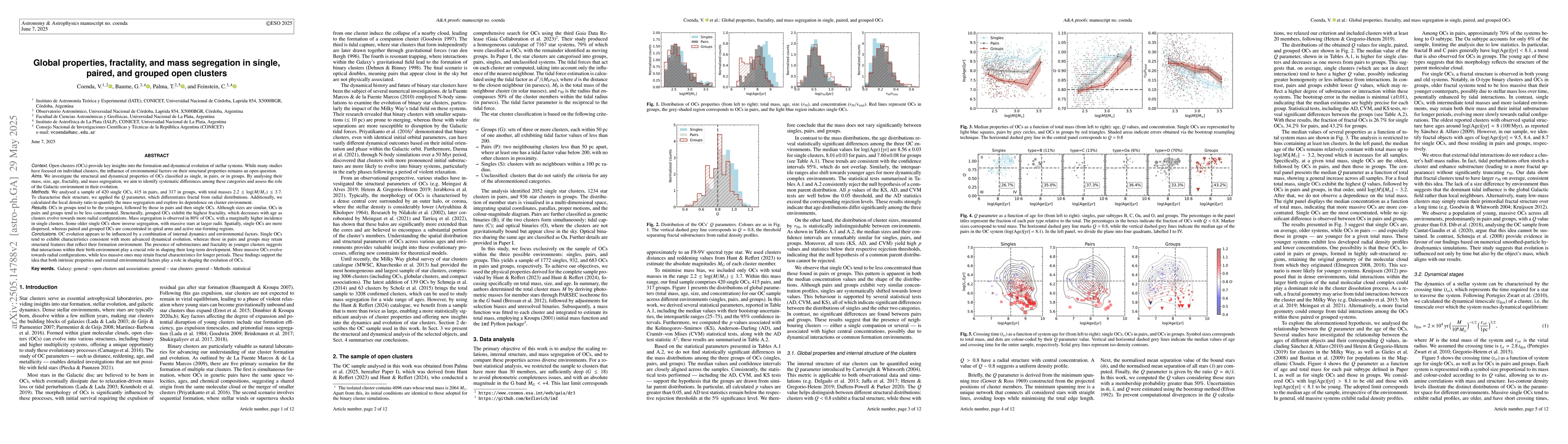 The study analyzes 420 single, 415 paired, and 317 grouped open clusters using the Q-parameter for structural characterization and local density ratio for mass segregation quantification.