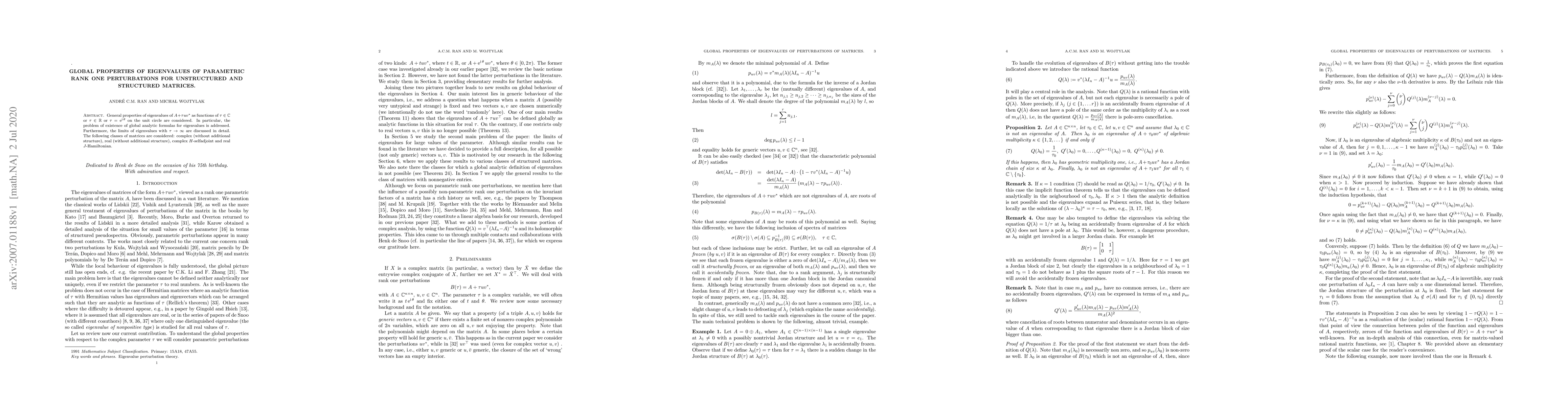 This paper investigates how eigenvalues of parametric rank one perturbations in matrices change as a parameter is introduced, focusing on global properties and limits. It explores various types of matrices, including complex, real, H-selfadjoint, and J-Hamiltonian.