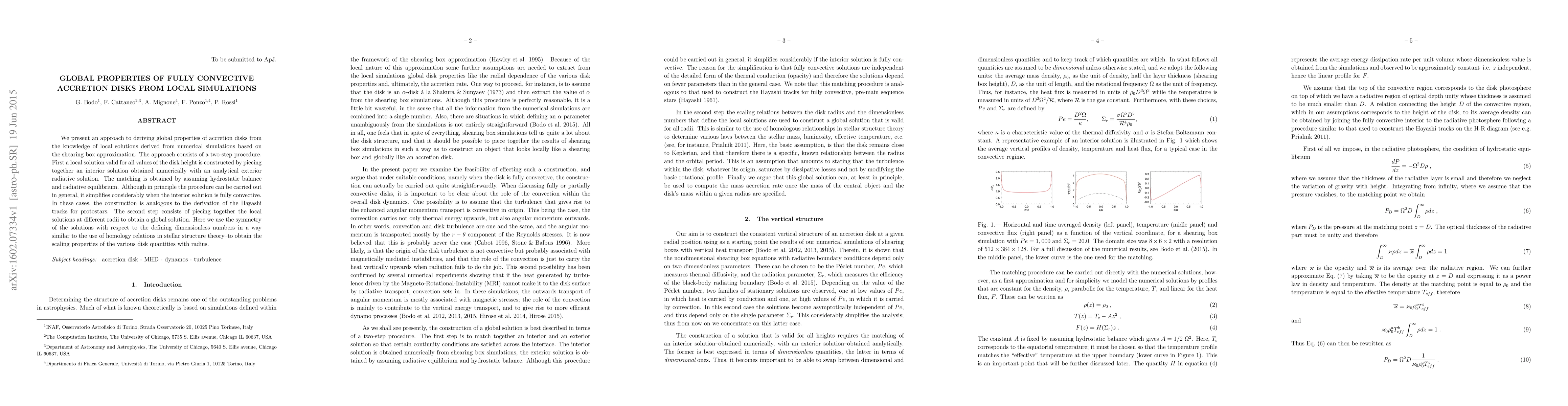 We present an approach to deriving global properties of accretion disks from the knowledge of local solutions derived from numerical simulations based on the shearing box approximation. The approach consists of a two-step procedure. First a local solution valid for all values of the disk height is constructed by piecing together an interior solution obtained numerically with an analytical exterior radiative solution. The matching is obtained by assuming hydrostatic balance and radiative equilibrium. Although in principle the procedure can be carried out in general, it simplifies considerably when the interior solution is fully convective. In these cases, the construction is analogous to the derivation of the Hayashi tracks for protostars. The second step consists of piecing together the local solutions at different radii to obtain a global solution. Here we use the symmetry of the solutions with respect to the defining dimensionless numbers--in a way similar to the use of homology relations in stellar structure theory--to obtain the scaling properties of the various disk quantities with radius.