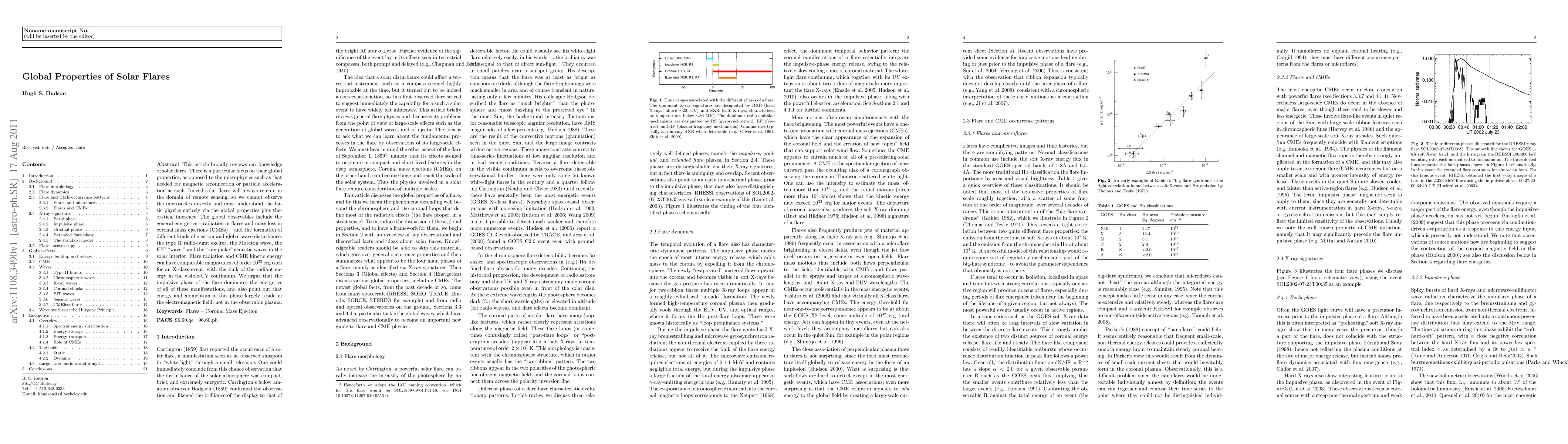 This research provides a comprehensive review of solar flares, focusing on their global properties as remote sensing precludes direct observation of microscales. It discusses various global observables, including energetics, mass loss in coronal mass ejections (CMEs), and different kinds of ejections and wave disturbances.