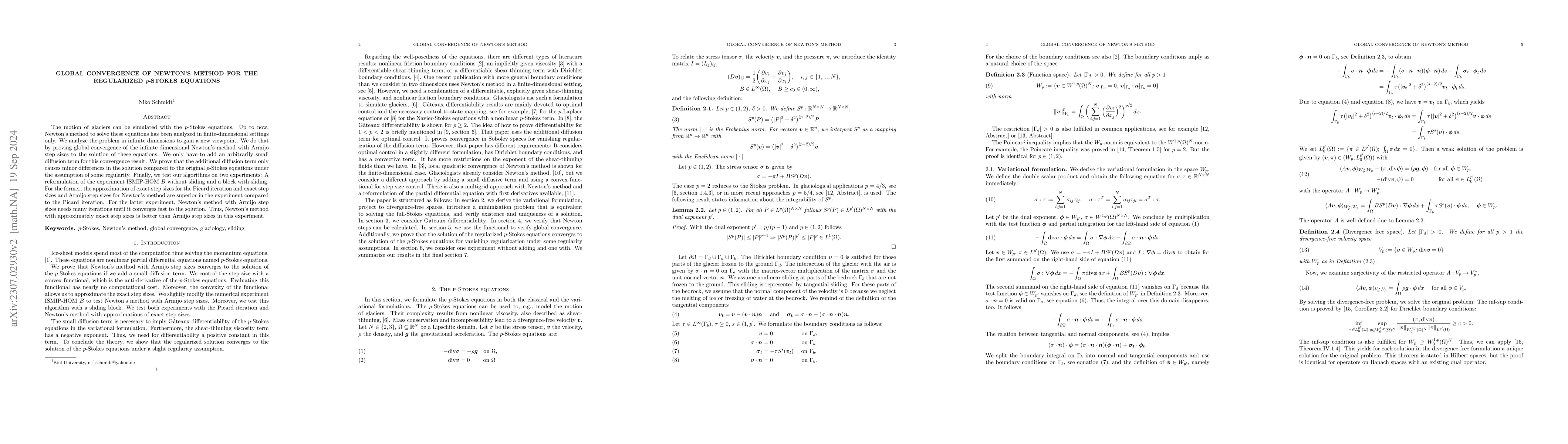 The motion of glaciers can be simulated with the p-Stokes equations. We present an algorithm that solves these equations faster than the Picard iteration. We do that by proving q-superlinear global convergence of the infinite-dimensional Newton's method with Armijo step sizes to the solution of these equations. We only have to add an arbitrarily small diffusion term for this convergence result. We also consider approximations of exact step sizes. Exact step sizes are possible because we reformulate the problem as minimizing a convex functional. Next, we prove that the additional diffusion term only causes minor differences in the solution compared to the original p-Stokes equations. Finally, we test our algorithms on a reformulation of the experiment ISMIP-HOM B. The approximation of exact step sizes for the Picard iteration and Newton's method is superior in the experiment compared to the Picard iteration. Also, Newton's method with Armijo step sizes converges faster than the Picard iteration. However, the reached accuracy of Newton's method with Armijo step sizes depends more on the resolution of the domain.