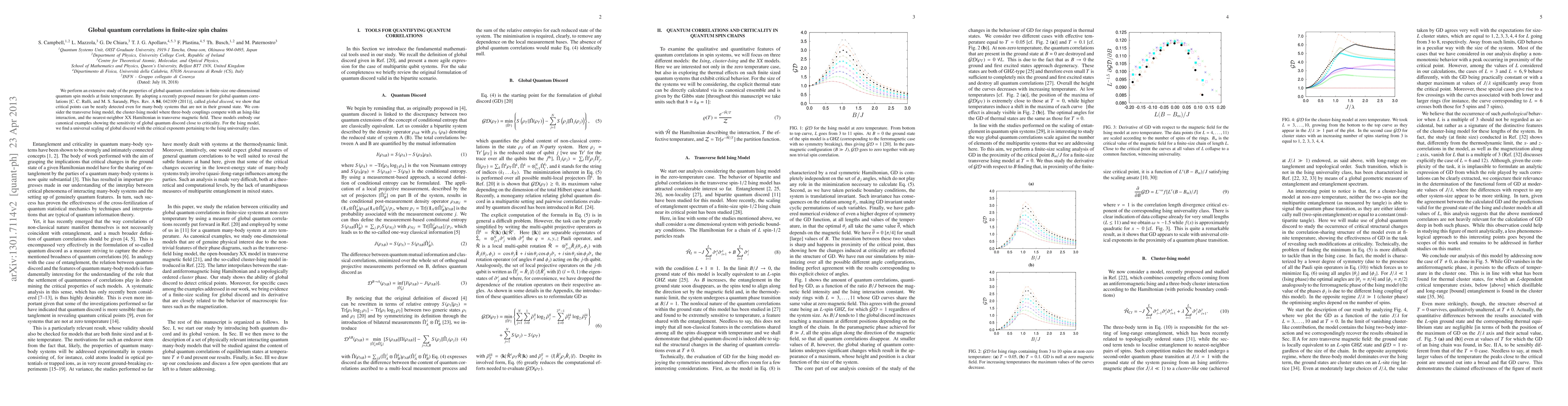 This paper investigates global quantum correlations, specifically global discord, in finite-size one-dimensional spin models at finite temperatures, revealing critical points' detection even in non-ground states. The study focuses on the transverse Ising, cluster-Ising, and XX Hamiltonian models, demonstrating universal scaling of global discord with the Ising critical exponents.