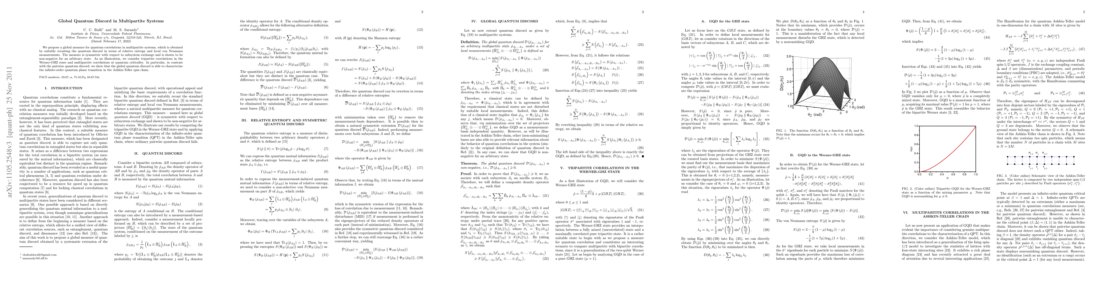 This paper introduces a new global measure for quantum correlations in multipartite systems, termed global quantum discord, which is derived from quantum discord and relative entropy. Unlike pairwise discord, this measure effectively captures infinite-order quantum phase transitions, as demonstrated in the Ashkin-Teller spin chain.