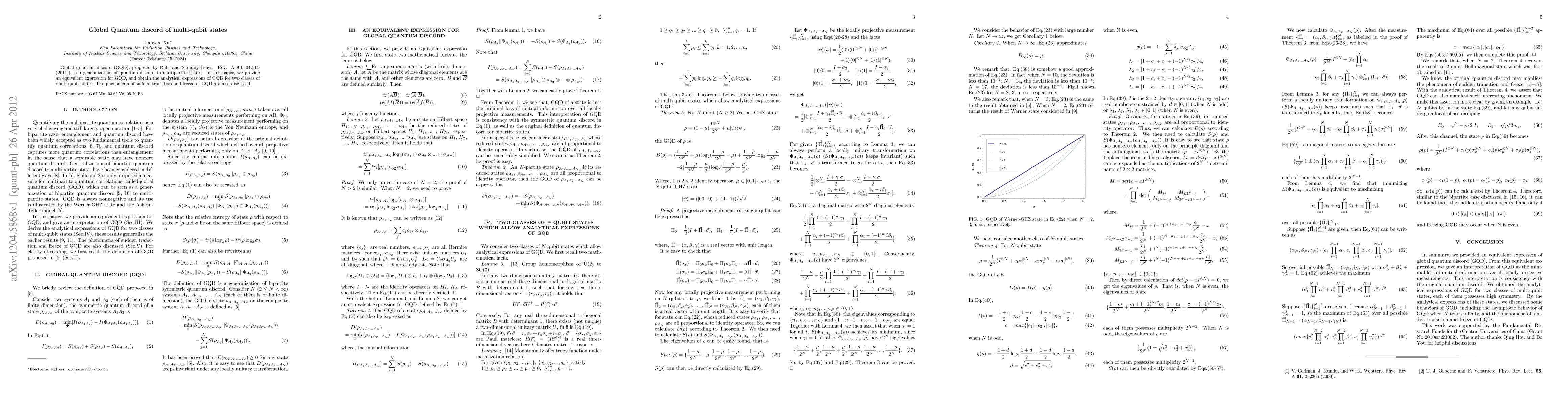 Researchers found an equivalent expression for global quantum discord in multi-qubit states and derived analytical expressions for two classes of these states, exploring phenomena like sudden transition and freeze of GQD.