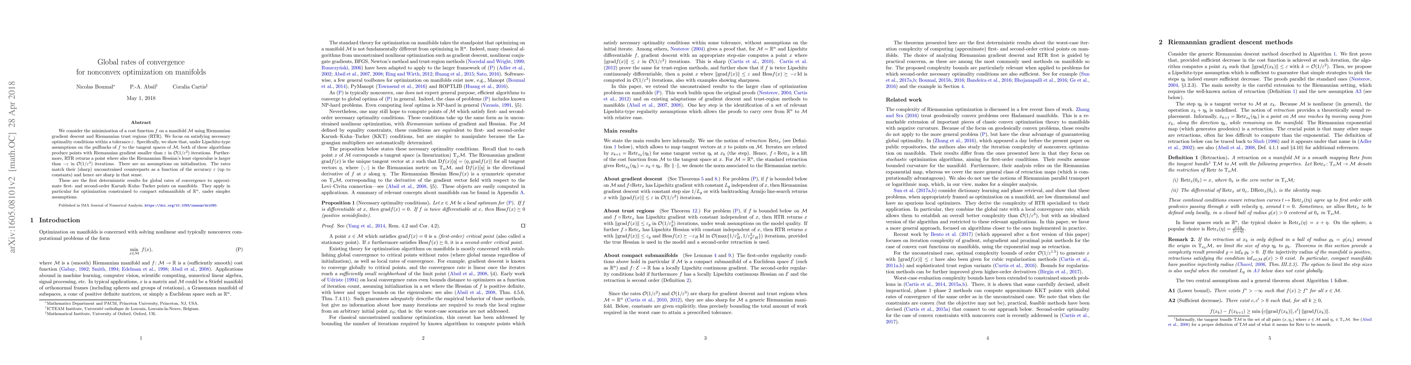 This paper establishes global convergence rates for nonconvex optimization on Riemannian manifolds using Riemannian gradient descent and trust regions. Both methods achieve convergence to optimality conditions within $O(1/\varepsilon^2)$ iterations, with the trust region method additionally reaching second-order conditions in $O(1/\varepsilon^3)$ iterations, matching the sharp unconstrained rates.