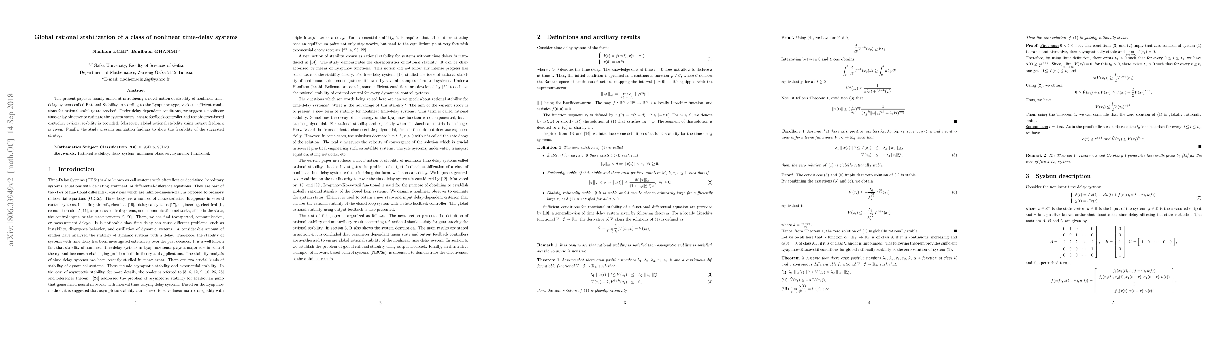 The present paper is mainly aimed at introducing a novel notion of stability of nonlinear time-delay systems called Rational Stability. According to the Lyapunov-type, various sufficient conditions for rational stability are reached. Under delay dependent conditions, we suggest a nonlinear time-delay observer to estimate the system states, a state feedback controller and the observer-based controller rational stability is provided. Moreover, global rational stability using output feedback is given. Finally, the study presents simulation findings to show the feasibility of the suggested strategy.