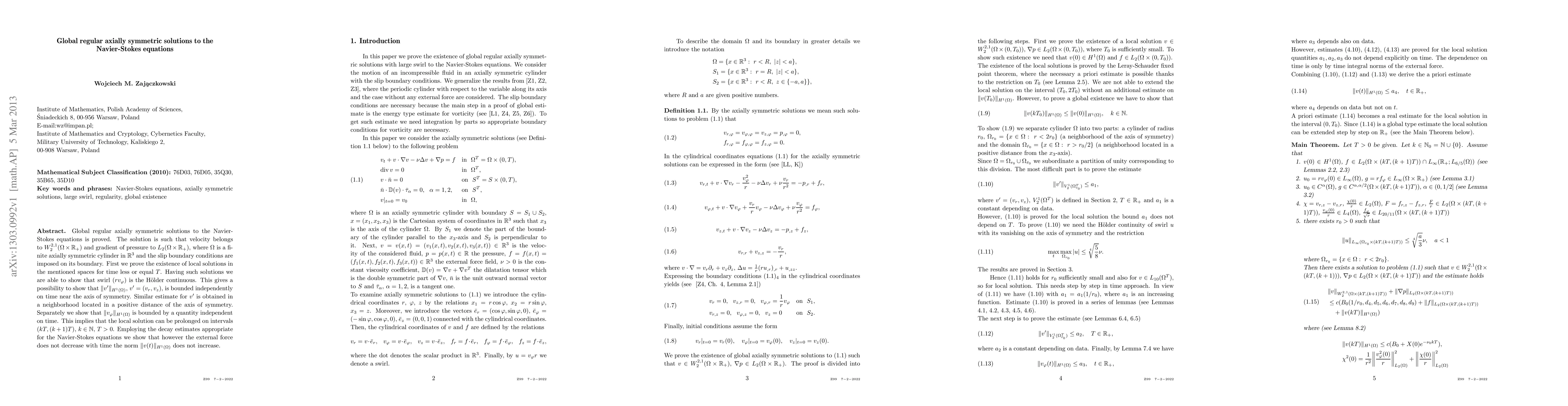 Summary: The paper proves the existence of global regular axially symmetric solutions to the Navier-Stokes equations within a bounded cylinder, establishing the Holder continuity of the swirl, which enables a global a priori estimate and allows the extension of local solutions over time.