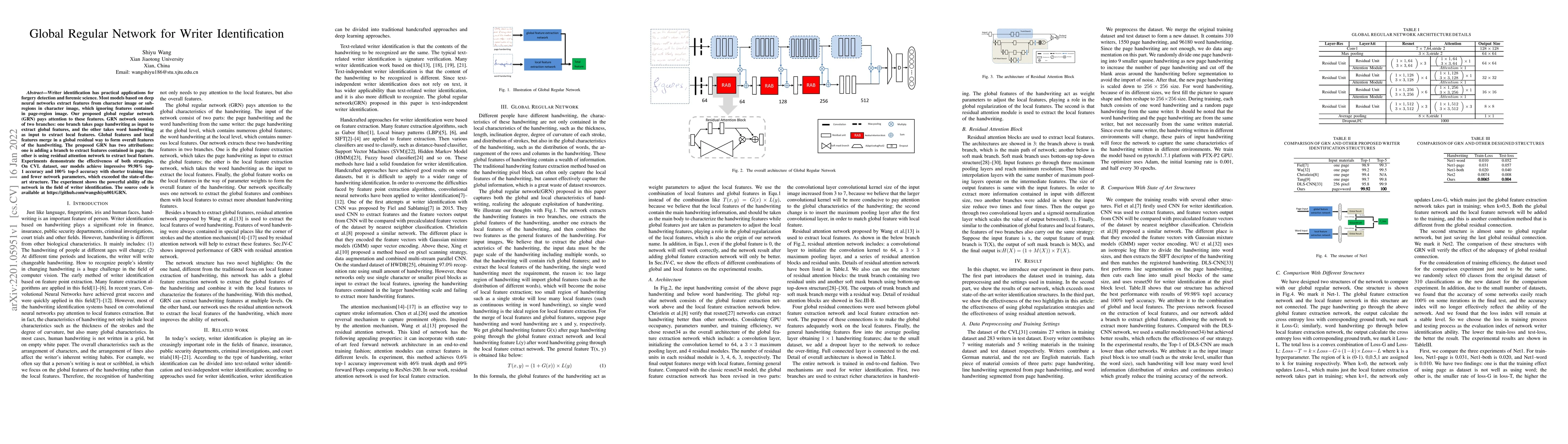 The paper proposes a Global Regular Network (GRN) for writer identification, which extracts both global page-region and local word-region features to enhance accuracy. The GRN achieves superior performance on the CVL dataset, demonstrating 99.98% top-1 accuracy and 100% top-5 accuracy with fewer parameters and shorter training time compared to existing models.