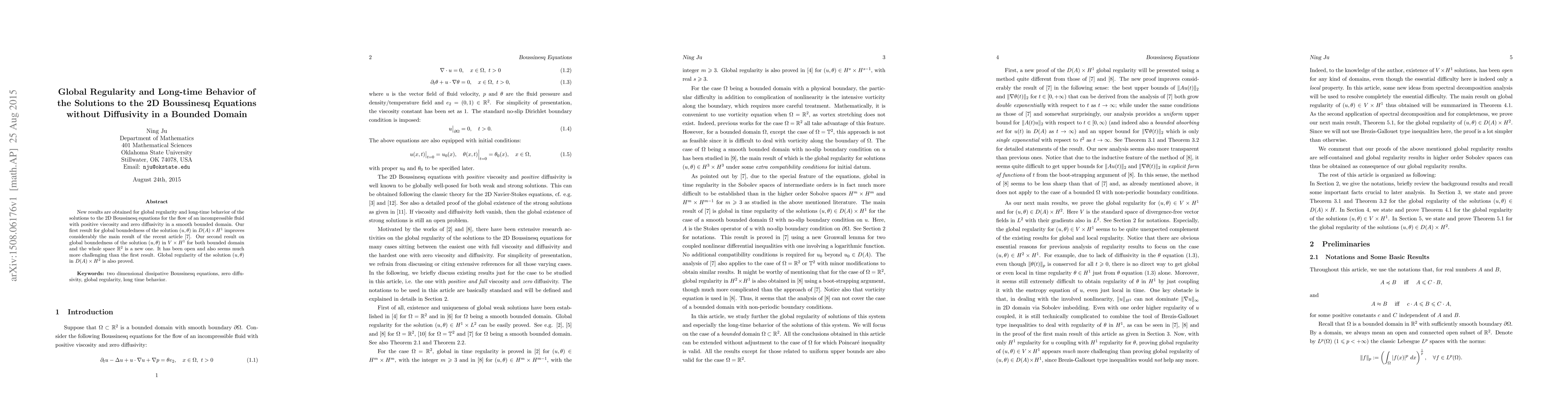 New results are obtained for global regularity and long-time behavior of the solutions to the 2D Boussinesq equations for the flow of an incompressible fluid with positive viscosity and zero diffusivity in a smooth bounded domain. Our first result for global boundedness of the solution $(u, \theta) \in D(A)\times H^1$ improves considerably the main result of the recent article [7]. Our second result on global regularity of the solution $(u, \theta) \in V \times H^1$ for both bounded domain and the whole space ${\mathbb R}^2$ is a new one. It has been open and also seems much more challenging than the first result. Global regularity of the solution $(u, \theta) \in D(A) \times H^2$ is also proved.