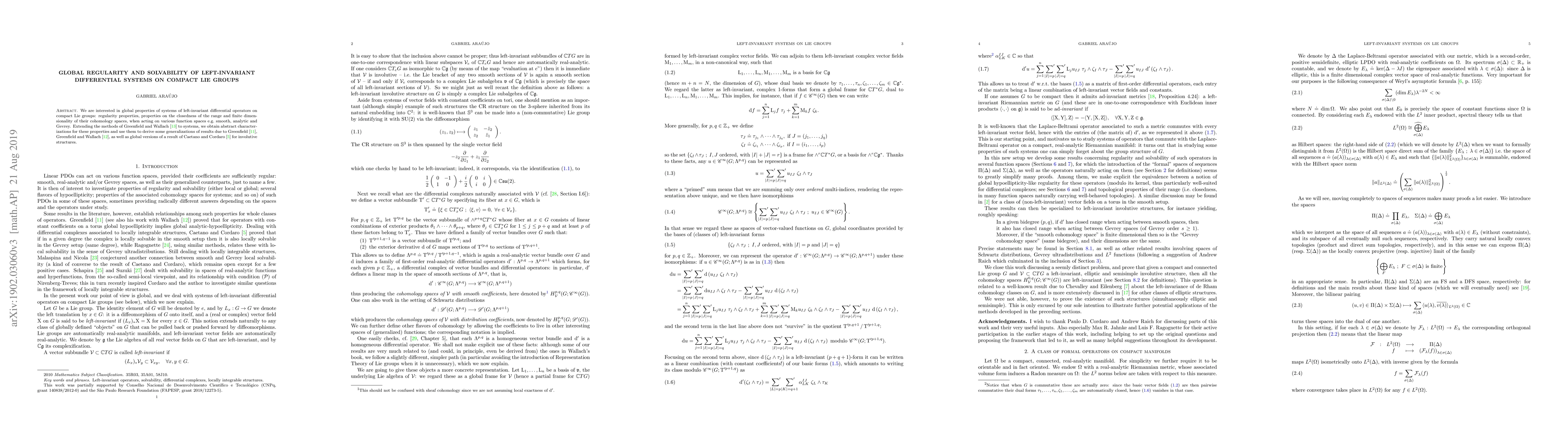 This paper investigates global properties of left-invariant differential systems on compact Lie groups, including regularity, closedness of range, and finite-dimensional cohomology. It extends previous methods to systems and generalizes results from earlier studies on these topics.