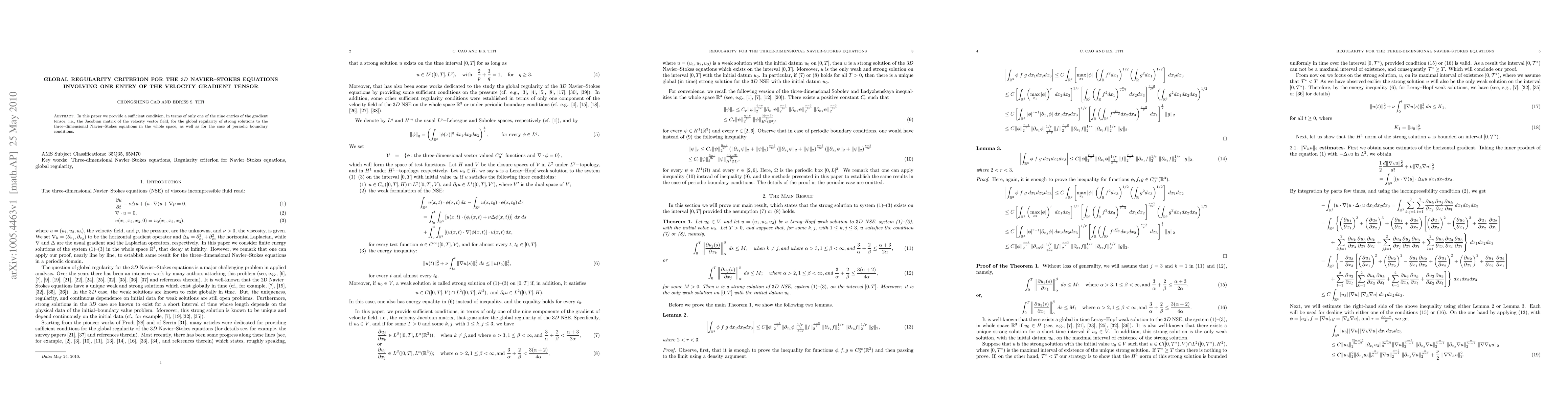 In this paper we provide a sufficient condition, in terms of only one of the nine entries of the gradient tensor, i.e., the Jacobian matrix of the velocity vector field, for the global regularity of strong solutions to the three-dimensional Navier-Stokes equations in the whole space, as well as for the case of periodic boundary conditions.