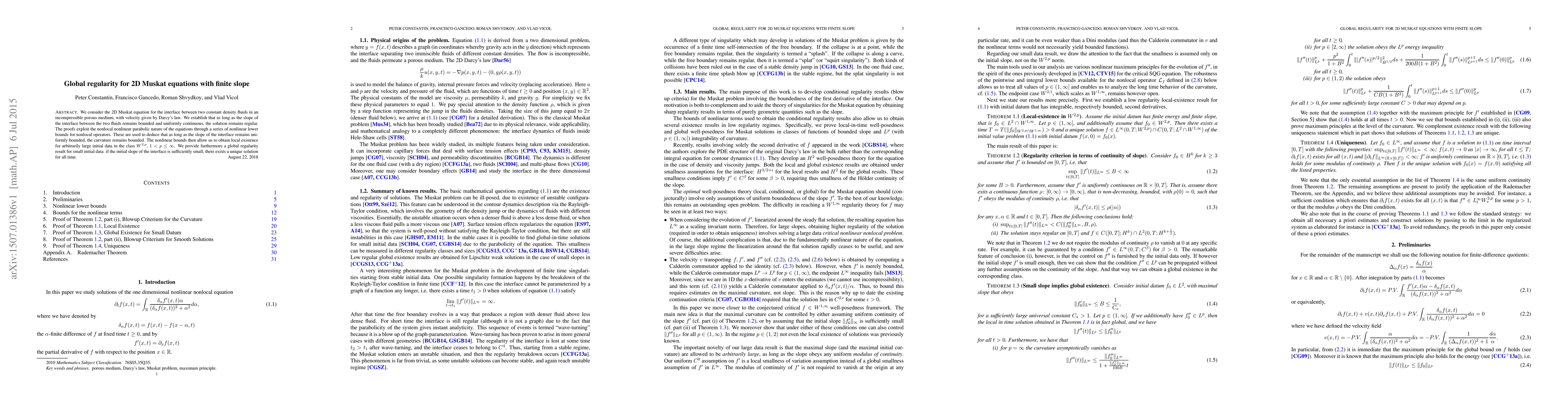 This research establishes that for the 2D Muskat equation governing fluid interfaces in porous media, regularity is maintained as long as the interface slope is bounded and continuous. Utilizing nonlinear lower bounds for nonlocal operators, the study proves local existence for large initial data and global regularity for small initial data, ensuring stable fluid behavior under Darcy's law.