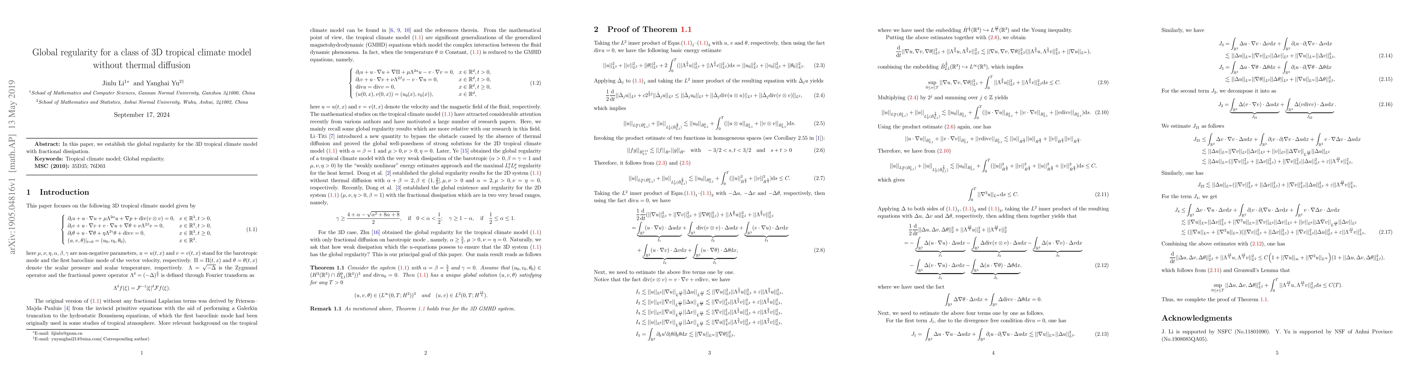 Summary: This paper proves the global regularity of solutions for a 3D tropical climate model featuring fractional dissipation, without the need for thermal diffusion. The findings provide a robust framework for understanding the model's long-term behavior.