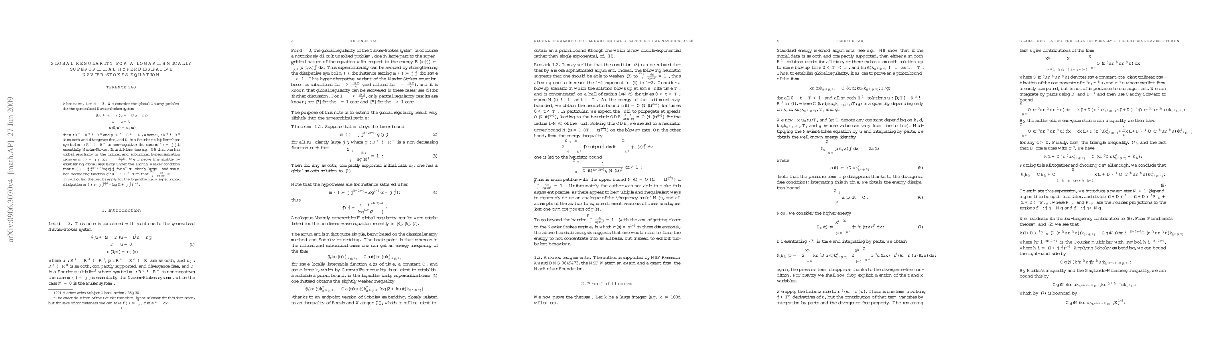 Let $d \geq 3$. We consider the global Cauchy problem for the generalised Navier-Stokes system \partial_t u + (u \cdot \nabla) u &= - D^2 u - \nabla p \nabla \cdot u &= 0 u(0,x) &= u_0(x) for $u: \R^+ \times \R^d \to \R^d$ and $p: \R^+ \times \R^d \to \R$, where $u_0: \R^d \to \R^d$ is smooth and divergence free, and $D$ is a Fourier multiplier whose symbol $m: \R^d \to \R^+$ is non-negative; the case $m(\xi) = |\xi|$ is essentially Navier-Stokes. It is folklore (see e.g. \cite{kp}) that one has global regularity in the critical and subcritical hyperdissipation regimes $m(\xi) = |\xi|^\alpha$ for $\alpha \geq \frac{d+2}{4}$. We improve this slightly by establishing global regularity under the slightly weaker condition that $m(\xi) \geq |\xi|^{(d+2)/4}/g(|\xi|)$ for all sufficiently large $\xi$ and some non-decreasing function $g: \R^+ \to \R^+$ such that $\int_1^\infty \frac{ds}{sg(s)^4} = +\infty$. In particular, the results apply for the logarithmically supercritical dissipation $m(\xi) := |\xi|^{\frac{d+2}{4}} / \log(2 + |\xi|)^{1/4}$.
