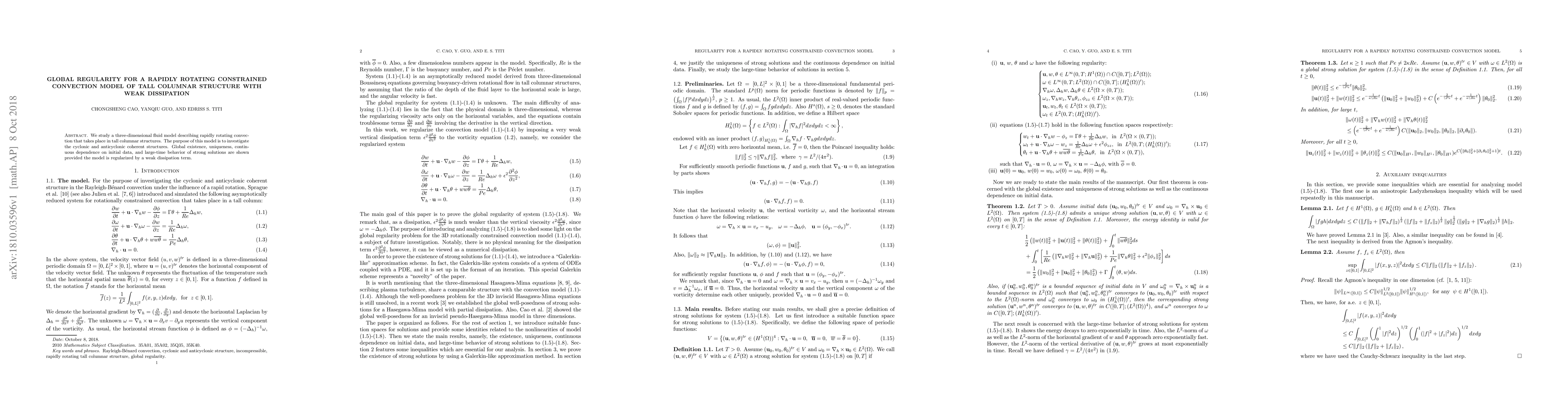 We study a three-dimensional fluid model describing rapidly rotating convection that takes place in tall columnar structures. The purpose of this model is to investigate the cyclonic and anticyclonic coherent structures. Global existence, uniqueness, continuous dependence on initial data, and large-time behavior of strong solutions are shown provided the model is regularized by a weak dissipation term.