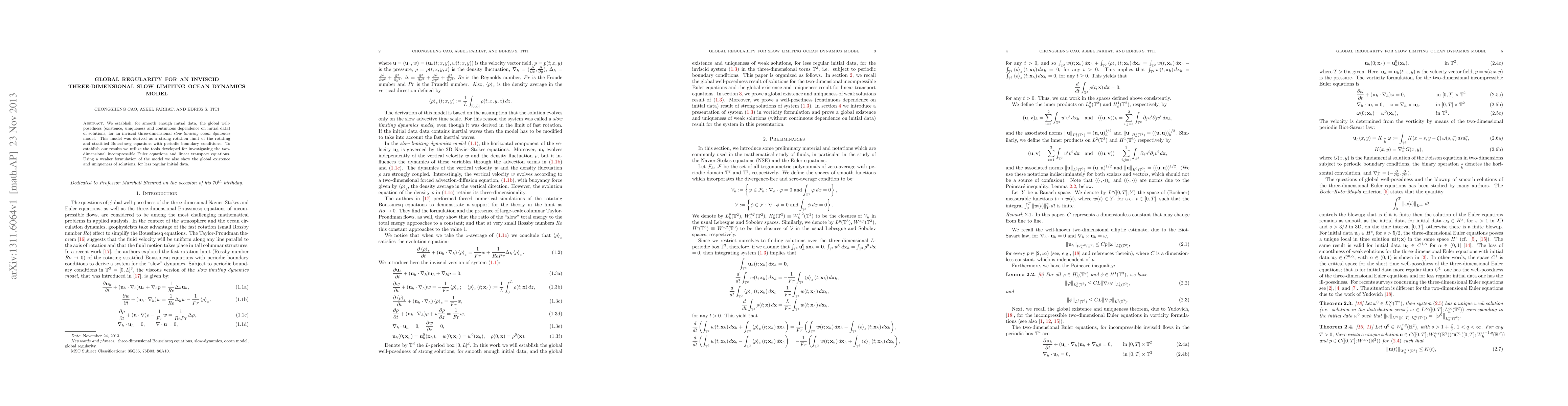 We establish, for smooth enough initial data, the global well-posedness (existence, uniqueness and continuous dependence on initial data) of solutions, for an inviscid three-dimensional {\it slow limiting ocean dynamics} model. This model was derived as a strong rotation limit of the rotating and stratified Boussinesg equations with periodic boundary conditions. To establish our results we utilize the tools developed for investigating the two-dimensional incompressible Euler equations and linear transport equations. Using a weaker formulation of the model we also show the global existence and uniqueness of solutions, for less regular initial data.