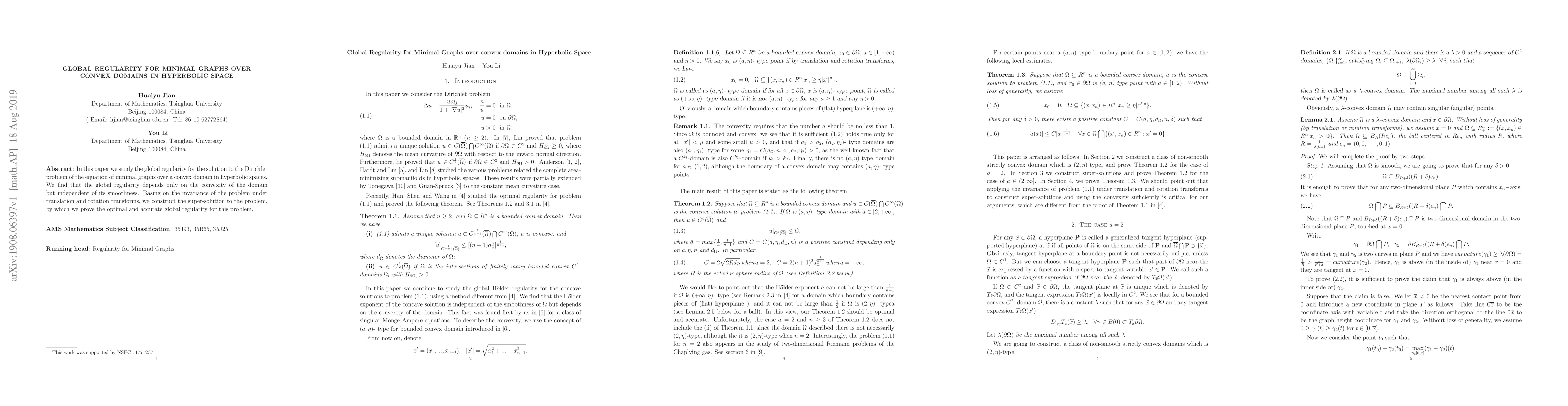 The paper investigates global regularity for minimal graphs over convex domains in hyperbolic space, finding it depends only on domain convexity, not smoothness.